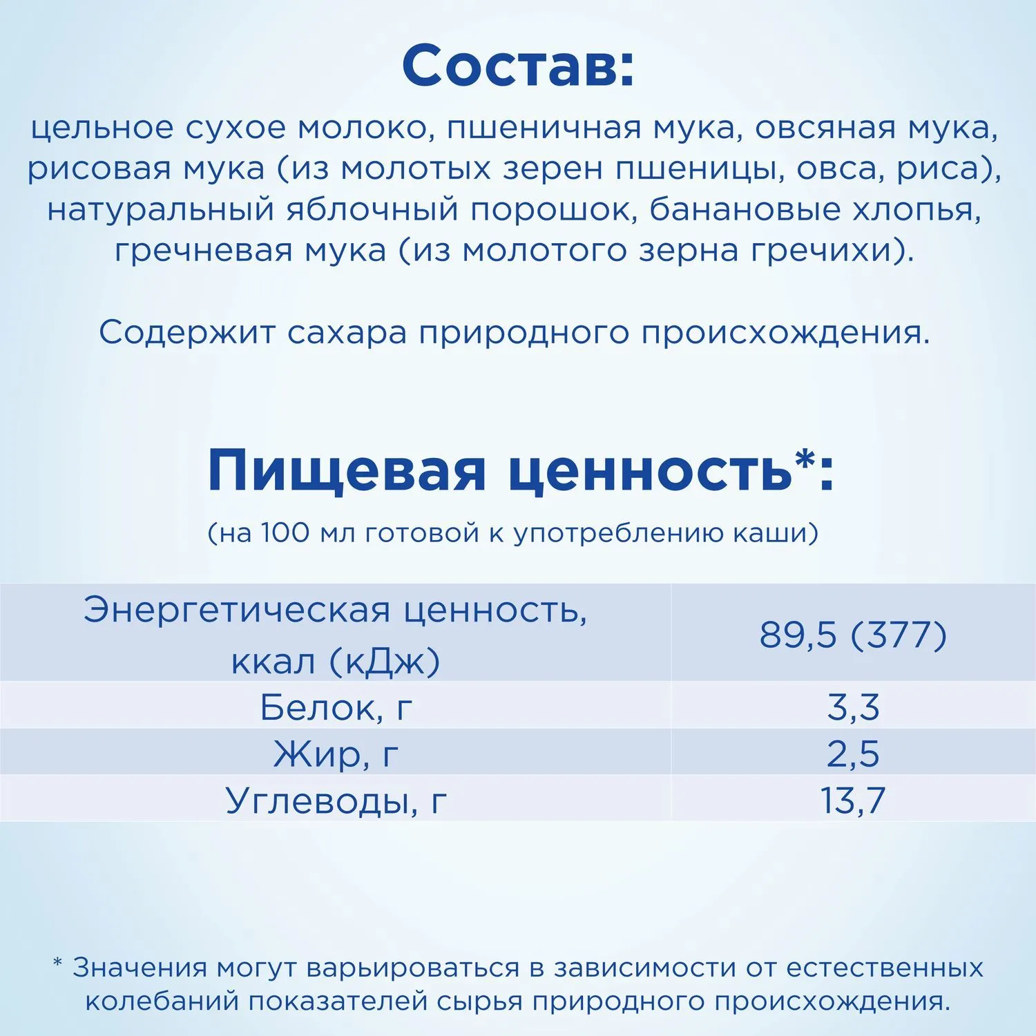 Молочная быстрорастворимая мультизлаковая каша с бананом и яблоком Nutrilon с 6 месяцев – 100% натуральная каша без искусственных добавок, в том числе красителей и консервантов. В составе только молотые зерна пшеницы, овса и риса, обработанные паром по специальной технологии для максимального сохранения витаминов, минералов и вкуса, цельное сухое молоко и натуральный фруктовый наполнитель! Натуральная молочная мультизлаковая каша Nutrilon с фруктами поможет разнообразить рацион малыша. Попробуйте всю линейку вкусов каш Нутрилон и выберите свой любимый! Для питания детей с 6 месяцев. Польза натуральных злаков и природная сладость фруктов! Мы тщательно отбираем сырье и производим детские каши по высоким стандартам качества. Каждая партия каш соответствует требованиям пищевой безопасности Европы и России и проверяется по физико-химическим и микробиологическим параметрам.