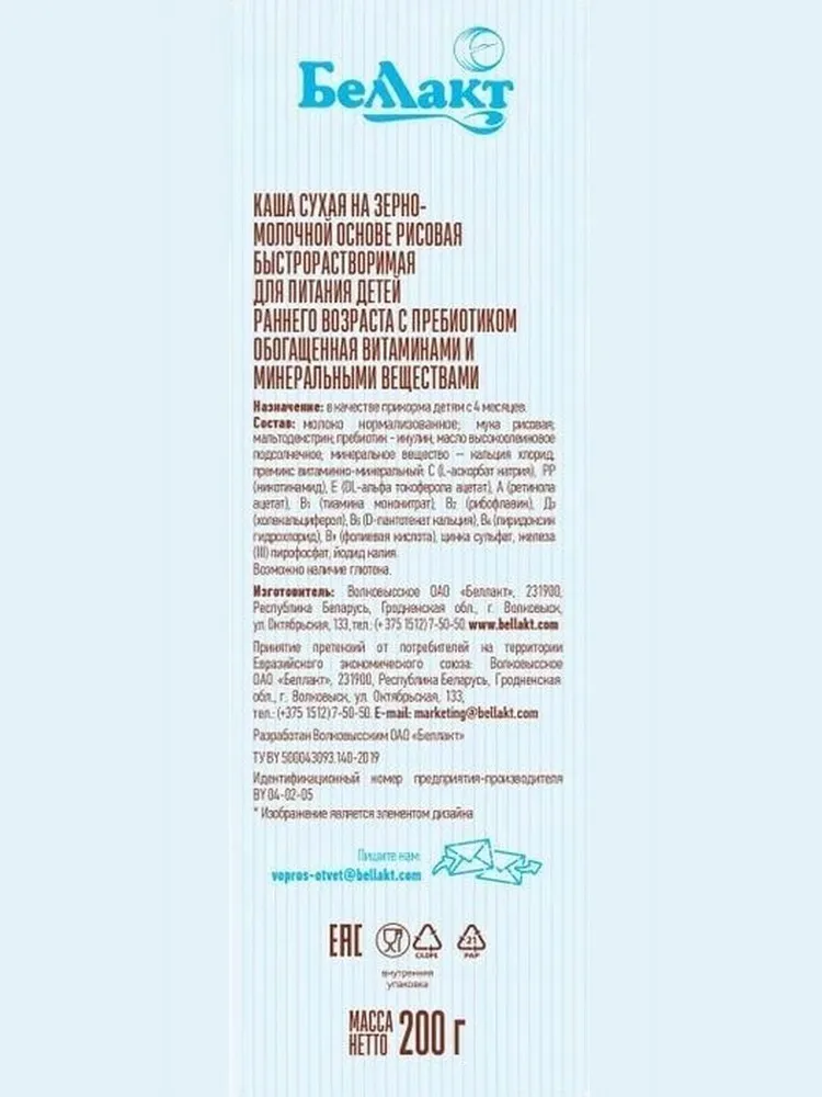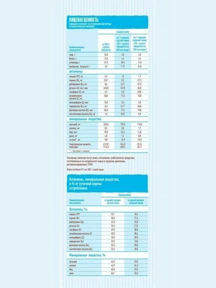 мука рисовая; молоко сухое цельное; мальтодекстрин; пребиотик - инулин; масло высокоолеиновое подсолнечное; минеральное веществo – кальция хлорид; премикс витаминно-минеральный: витамины: С (L-аскорбат натрия), РР (никотинамид), Е (DL-альфа токоферола ацетат), А (ретинола ацетат), В1 (тиамина мононитрат), В2 (рибофлавин), Д3 (холекальциферол), В5 (D-пантотенат кальция), В6 (пиридоксин гидрохлорид), В9 (фолиевая кислота), цинка сульфат, железа (III) пирофосфат, йодид калия.