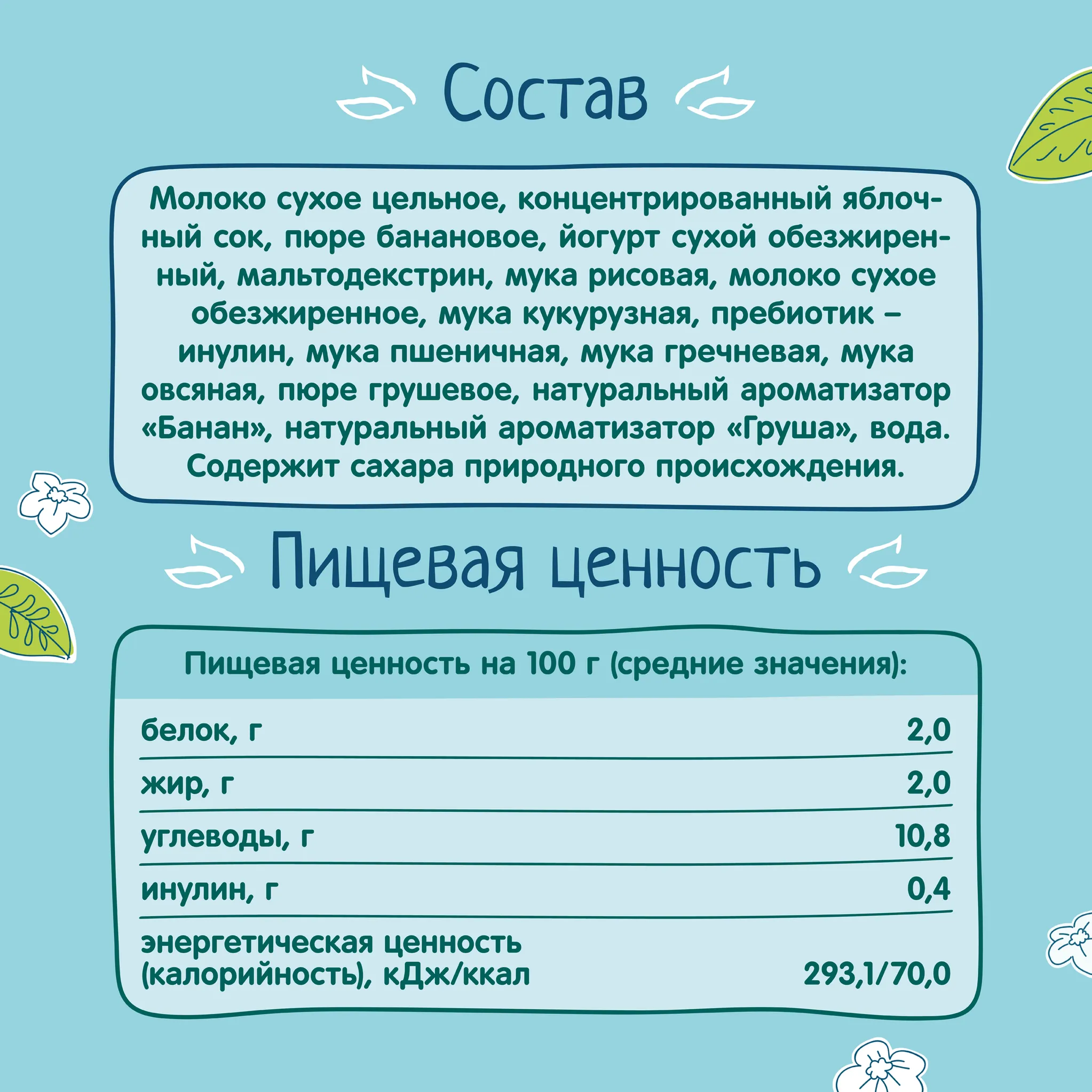 - Состав: молоко сухое цельное, фруктоза, пюре банановое, мальтодекстрин, мука рисовая, молоко сухое обезжиренное, пребиотик – инулин, мука кукурузная, мука пшеничная, мука овсяная, мука гречневая, пюре клубничное, ароматизатор натуральный «Груша», ароматизатор натуральный «Банан», вода