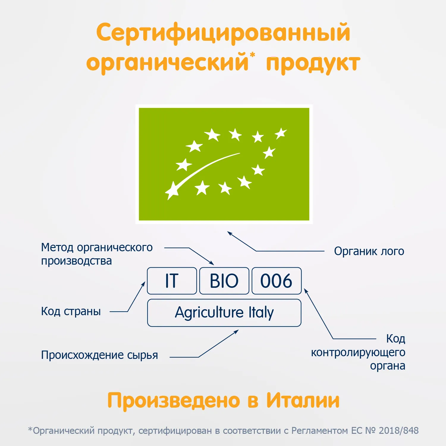 - Органический продукт, произведен и сертифицирован в соответствии с Регламентами Европейского Союза № 834/2007 и № 889/2008 об органическом сельском хозяйстве