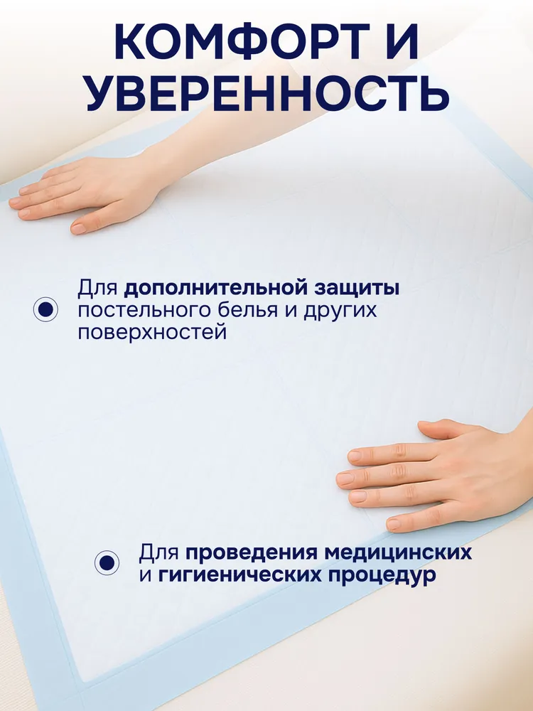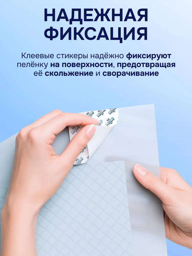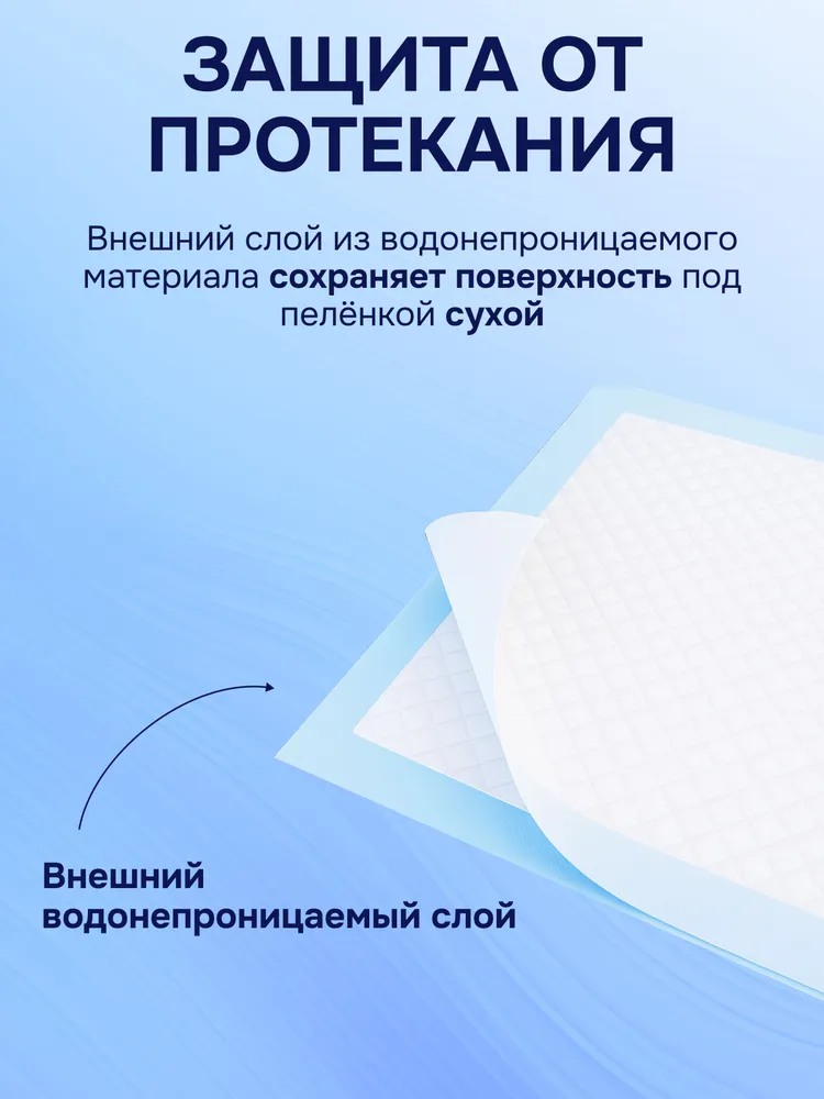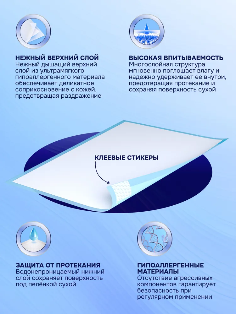 Нижний водонепроницаемый слой не допускает протекания и надёжно защищает любые поверхности от влаги. Благодаря клеевым стикерам, пелёнка надежно фиксируется на кровати, кресле или другом основании, не скользят и не сворачиваются. Они удобны как для медицинского персонала, так и для домашнего ухода.
