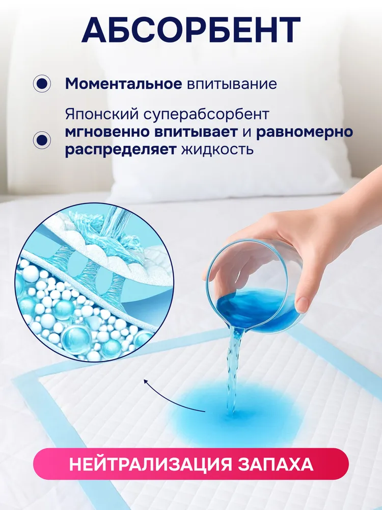 Большой размер 60×90 см позволяет использовать пелёнки для защиты постельного белья и мебели от намокания. Внутренний абсорбирующий слой на основе японского суперабсорбента мгновенно впитывает до 1200 мл жидкости, надёжно удерживая её внутри и блокируя неприятные запахи. Благодаря многослойной структуре влага равномерно распределяется по поверхности.