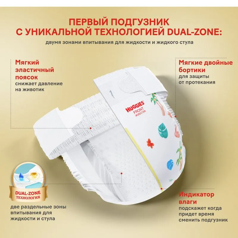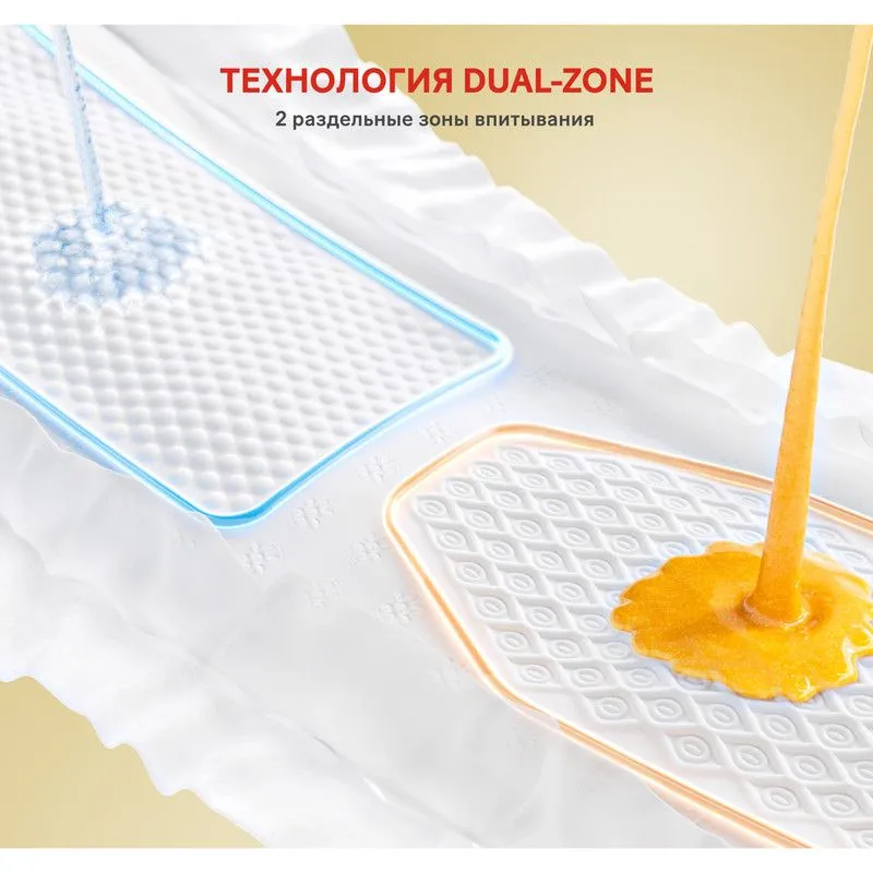 Технология Dual Zone позволяет за секунды впитывать жидкость и стул, а мягкие подушечки обеспечивают комфорт и отсутствие раздражения на нежной и чувствительной коже новорожденных.