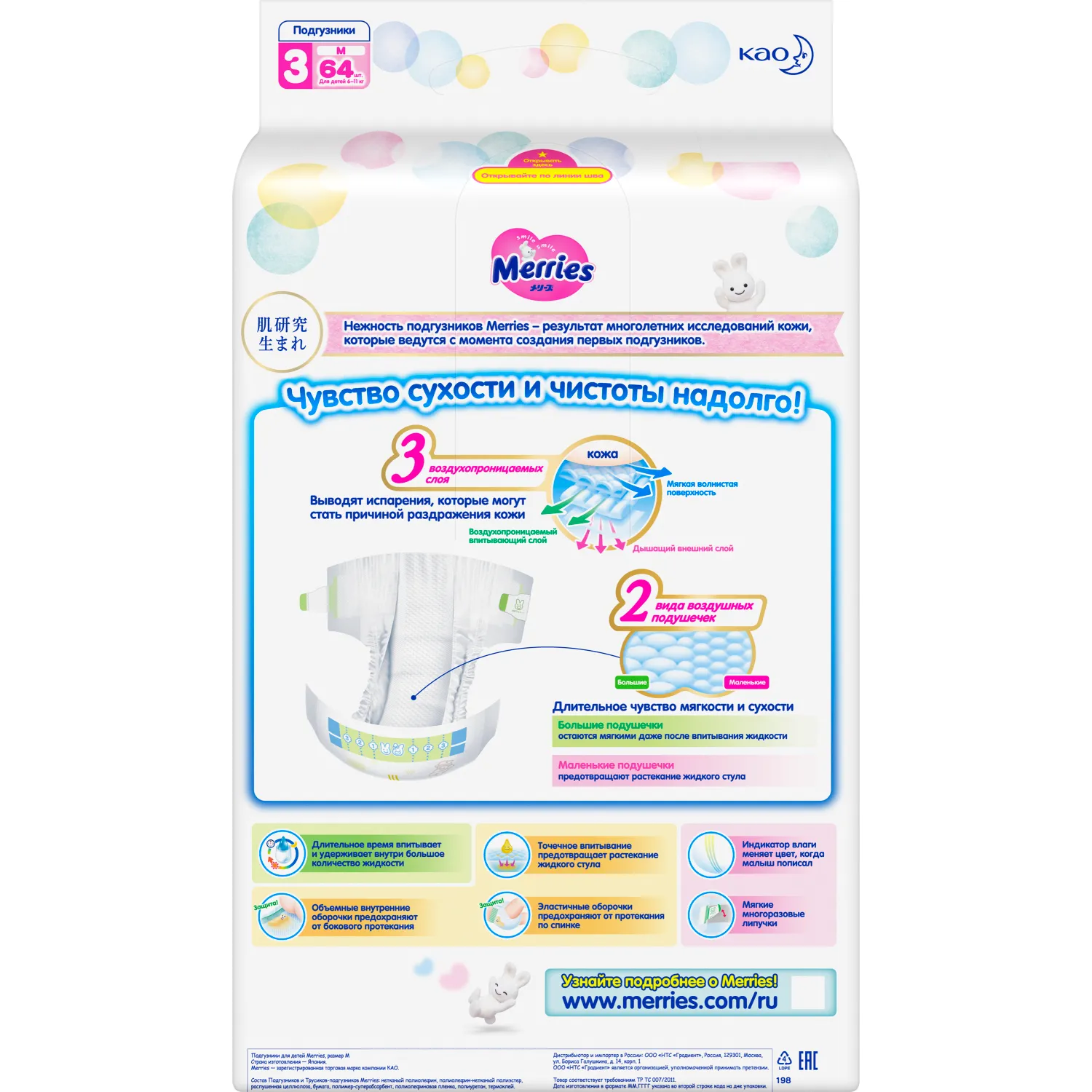 етские одноразовые японские подгузники Merries (Меррис) для малышей с весом от 6 до 11 кг (размер M, 3) созданы с особенной заботой о коже и комфорте Вашего ребёнка. Merries – победитель премии «Марка №1 в России» 2022 г. в категории «Подгузники и трусики для детей» в и лучший бренд для малышей по признанию мам. Гипоаллергенные материалы, неощутимые на теле малыша, не вызывают раздражений, опрелостей и дискомфорта. Обновлённая технология трёх воздухопроницаемых слоёв сохраняет кожу малыша сухой и здоровой, обеспечивая свободное выведение прелого воздуха из подгузника. Полимерный абсорбент отлично впитывает большое количество жидкости, превращает её в гель и защищает от протеканий даже при значительном надавливании. Нежные воздушные подушечки внутреннего слоя теперь содержат в три раза больше воздуха в сравнении с предыдущим поколением подгузников Меррис. Новый материал с увеличенными ячейками в центральной зоне подгузника моментально впитывает влагу и минимизирует её контакт с чувствительной кожей малыша. Углубления на поверхности волнистого слоя надёжно удерживают жидкий стул, предотвращая его растекание по подгузнику. А оборочки плотно облегают ножки и держатся даже на подвижном ребёнке. Внутренняя поверхность подгузника остаётся удивительно мягкой для кожи ребёнка и не прилипает к попке даже после того, как впитает большой объём жидкости. Трёхполосный индикатор наполнения легко проверить, не раздевая полностью малыша. Если полоски сменили цвет, подгузник пора заменить на новый. Впитывающий слой располагается по всей поверхности подгузника, поэтому жидкость не скапливается в одном месте, подгузник не сбивается в комок, не провисает и не стесняет движений малыша. Подгузники Merries подходят для девочек и для мальчиков. Не требуют использования защитных кремов и присыпок. Почти не заметны под одеждой и меняются бесшумно: вы не разбудите своего кроху шуршанием материала и фиксирующих липучек во время сна.