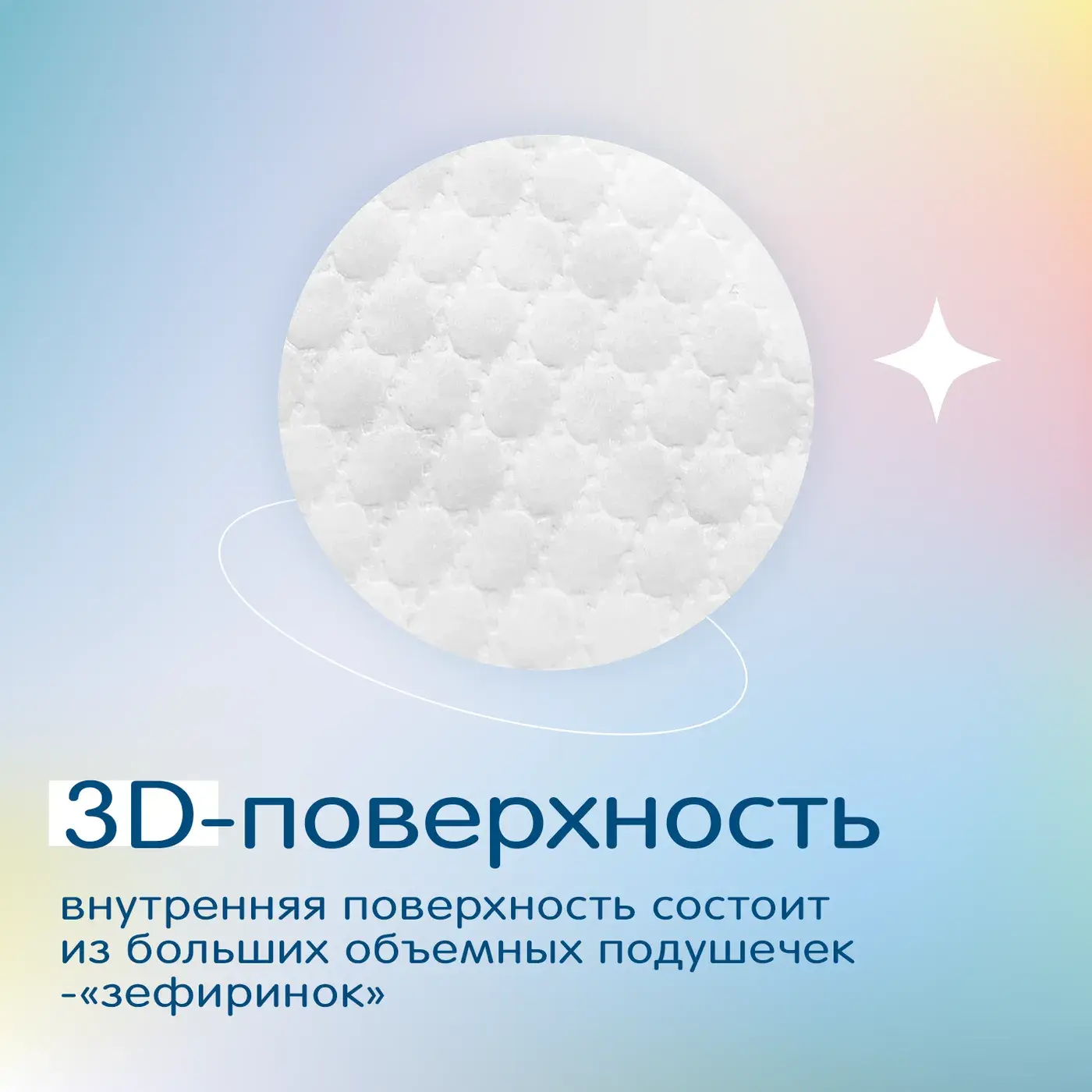 Впитывающий слой состоит из мягчайших «подушечек», которые мгновенно впитывают мочу и жидкий стул. Объемная текстура поверхности бережно контактирует с чувствительной кожей малыша, не вызывая излишнего трения и раздражений.