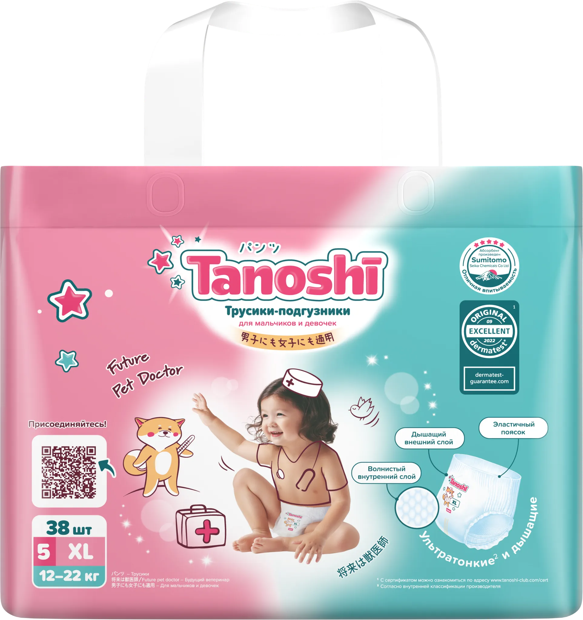 Детские трусики-подгузники Tanoshi (Таноши) для малышей с весом 12-22 кг – ультратонкие, как хлопковое бельё, и мягкие одноразовые трусики. Они не стесняют движения непоседы, который активно ползает и делает первые шаги. Tanoshi – лучший выбор родителей, для которых важны доказанное качество и справедливая цена.