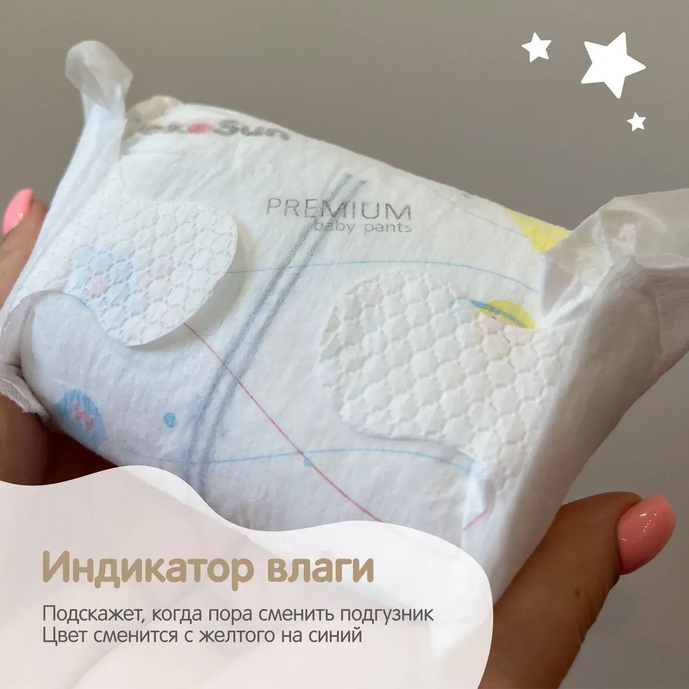 - Индикатор влаги подскажет, когда пора сменить подгузник.