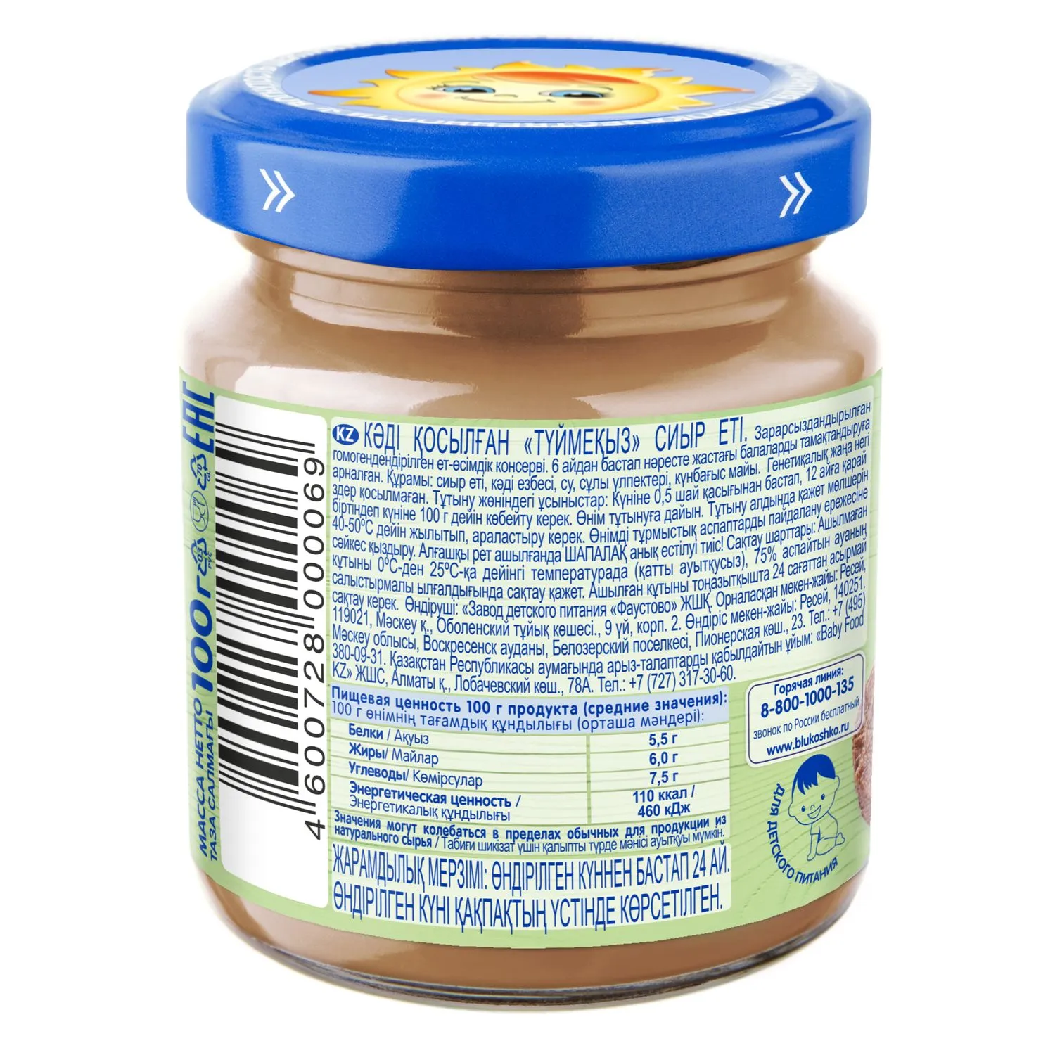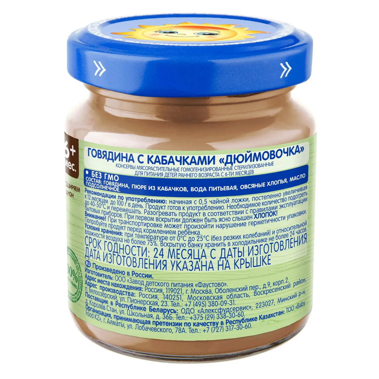 Пюре Бабушкино лукошко Говядина с кабачком «Дюймовочка» для питания детей с 6 месяцев.