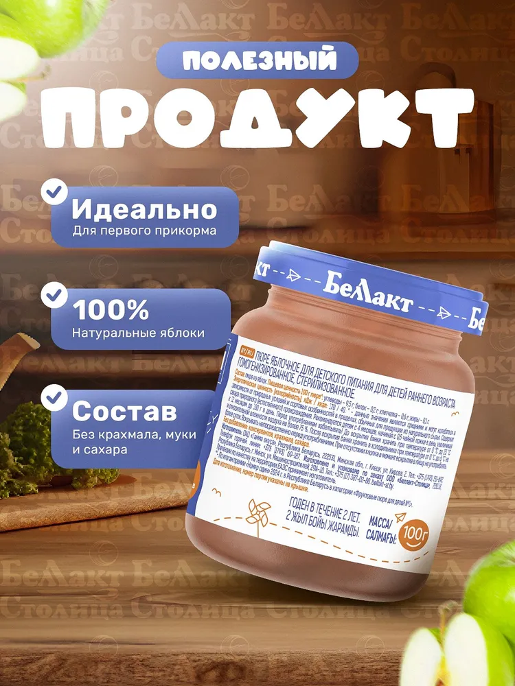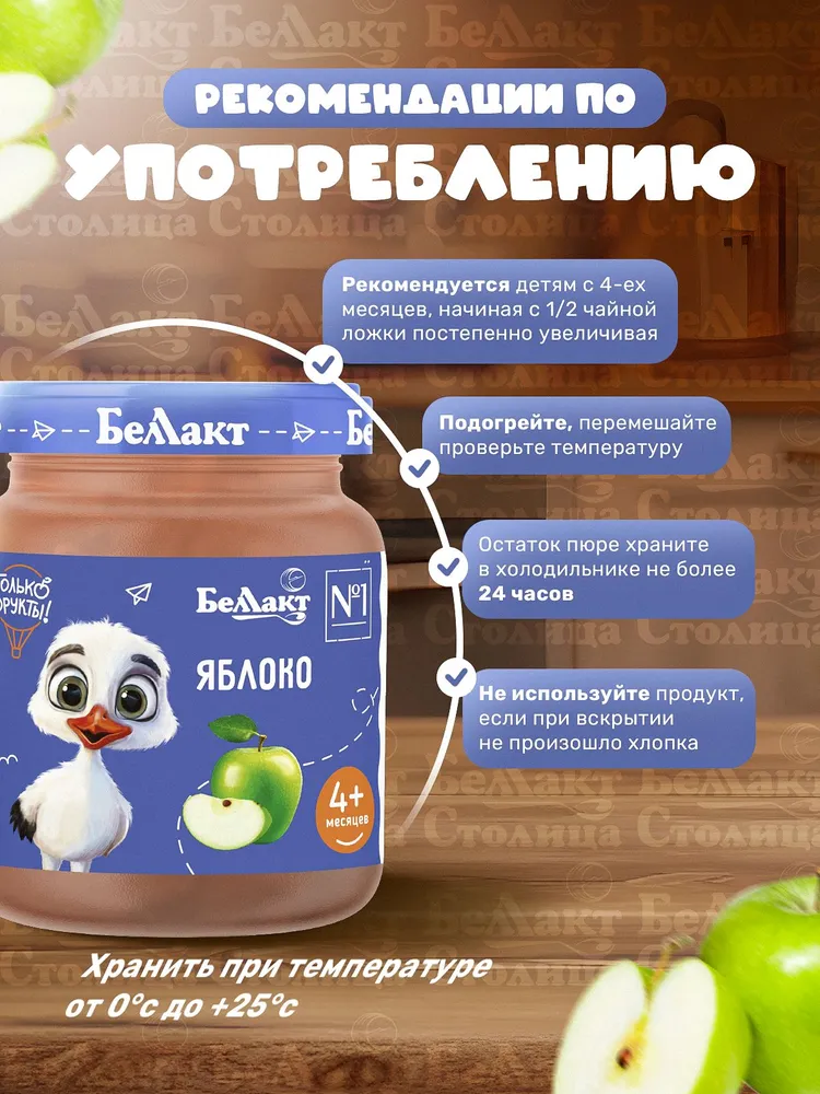 Фруктовое яблочное пюре для детей производителя "Беллакт-Столица" станет отличным выбором для первого прикорма малышей. Этот продукт создан специально с заботой о здоровье ребенка и подходит для питания детей с 4 месяцев. Натуральное пюре приготовлено без добавления сахара и искусственных добавок, что делает его безопасным и полезным для маленького организма.