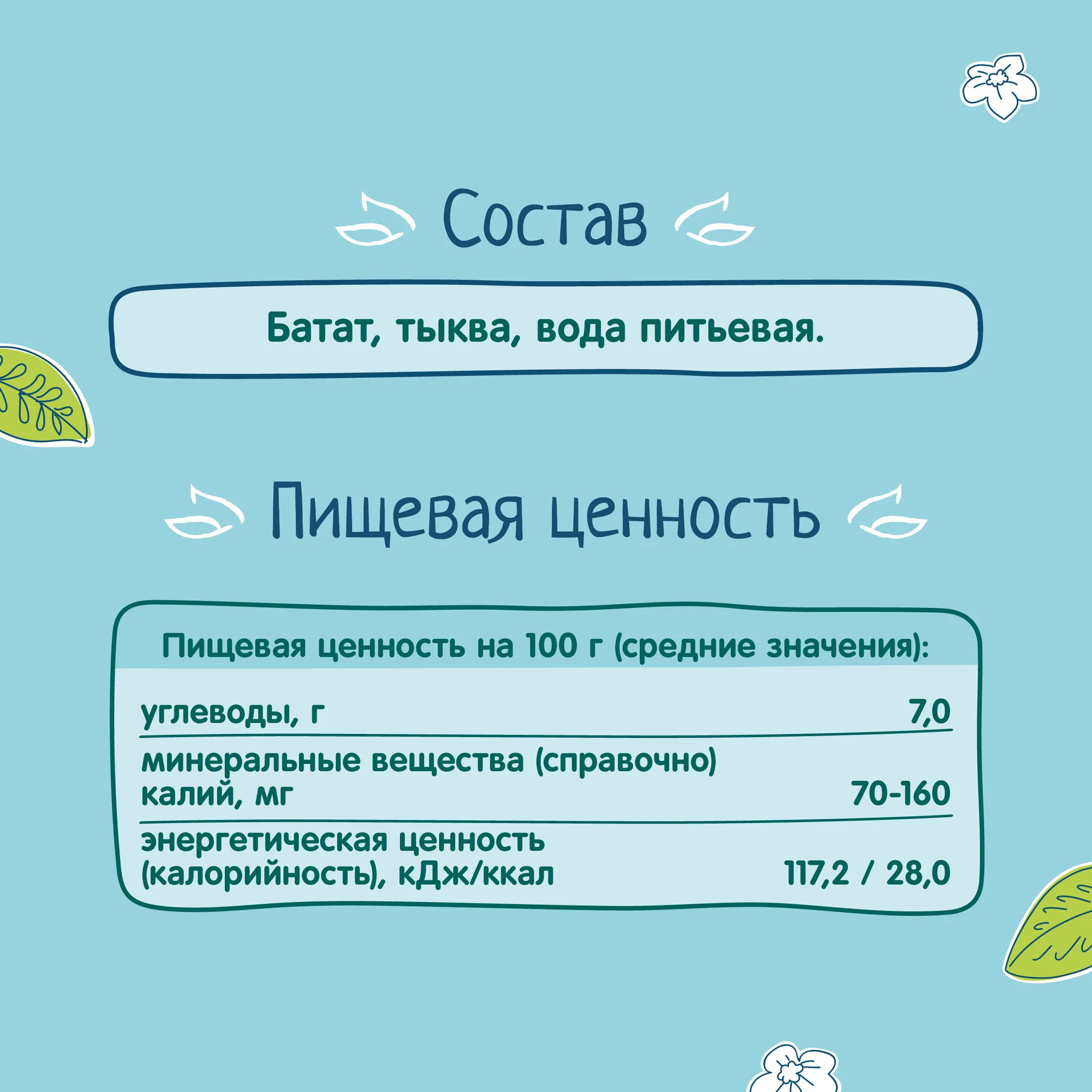 Мы не добавляем в наше пюре красители, соль или крахмал, чтобы сохранить натуральный вкус и полезные свойства отборных овощей. Пюре из батата с тыквой можно включать в рацион уже с 5 месяцев. Увеличенный объем 110 г – идеальная порция для обеда или ужина.