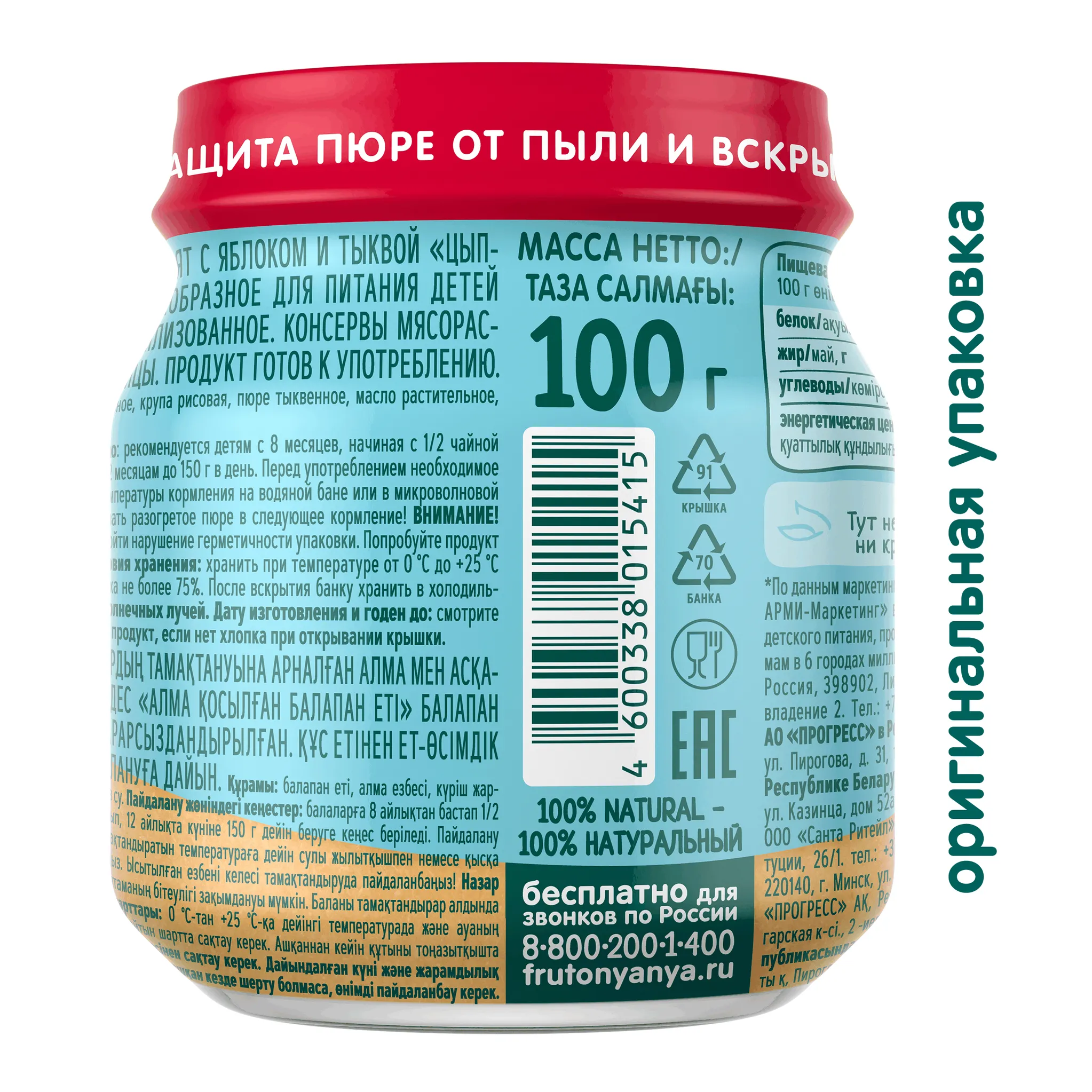 Состав: Мясо цыплят, пюре яблочное, крупа рисовая, пюре тыквенное, масло растительное, вода питьевая.