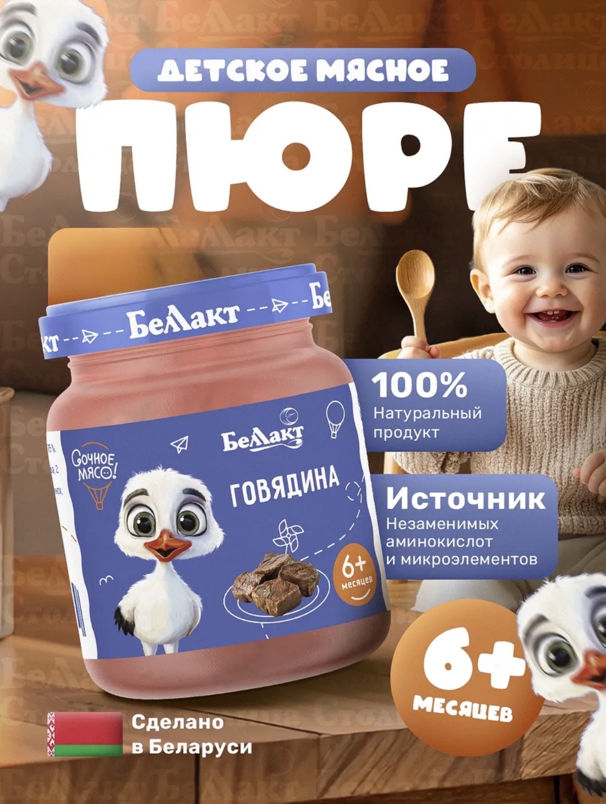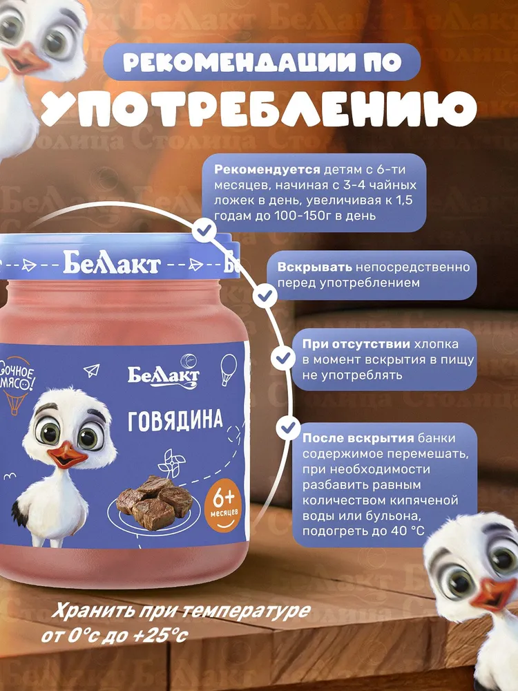 Детское мясное пюре на основе говядины идеально подходит для первого прикорма малышей с шести месяцев. Продукт выпускается в удобной стеклянной баночке с герметичной крышкой, обеспечивающей надежность хранения и сохранение всех полезных свойств. Нежная текстура пюре разработана специально для детского питания — гомогенизированная масса легко усваивается организмом ребенка.