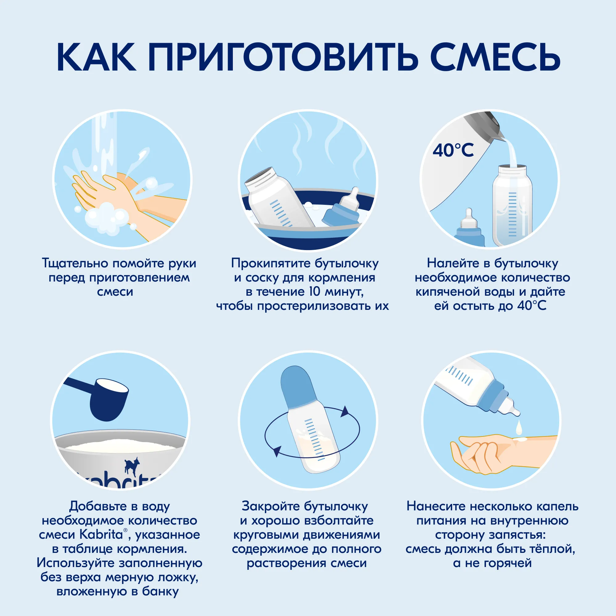 Точно следуйте инструкциям на банке. Несоблюдение инструкций по приготовлению смеси может нанести вред здоровью ребенка. Всегда проверяйте температуру готовой смеси перед кормлением, капнув ее на внутреннюю сторону запястья. Никогда не используйте остатки разведенной смеси для последующего кормления! Во время кормления необходимо поддерживать ребенка, чтобы он не поперхнулся. Использование некипяченной воды, нестерилизованной посуды, неправильное хранение, транспортировка, приготовление и кормление может привести к неблагоприятным последствиям для здоровья ребенка.