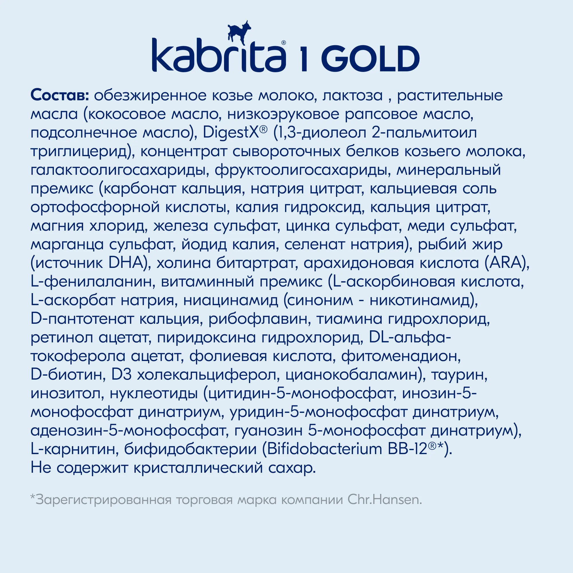 обезжиренное козье молоко, лактоза, растительные масла (кокосовое масло, низкоэруковое рапсовое масло, подсолнечное масло), 1,3-диолеол, 2-пальмитоил триглицерид, концентрат сывороточных белков козьего молока, галактоолигосахариды, фруктоолигосахариды, минеральный премикс (карбонат кальция, натрия цитрат, кальциевая соль ортофосфорной кислоты, калия гидроксид, кальция цитрат, магния хлорид, железа сульфат, цинка сульфат, меди сульфат, марганца сульфат, йодид калия, селенат натрия), рыбий жир (источник DHA), холина битартрат, арахидоновая кислота, L-фенилаланин, витаминный премикс (L-аскорбиновая кислота, L-аскорбат натрия, ниацинамид (синоним - никотинамид), D-пантотенат кальция, рибофлавин, тиамина гидрохлорид, ретинол ацетат, пиридоксина гидрохлорид, DL-альфа-токоферола ацетат, фолиевая кислота, фитоменадион, D-биотин, D3 холекальциферол, цианокобаламин), таурин, инозитол, нуклеотиды (цитидин-5-монофосфат, инозин-5-монофосфат динатриум, уридин-5-монофосфат динатриум, аденозин-5-монофосфат, гуанозин 5-монофосфат динатриум), L-карнитин, бифидобактерии. BB-12® * - зарегистрированная торговая марка компании Chr.Hansen.