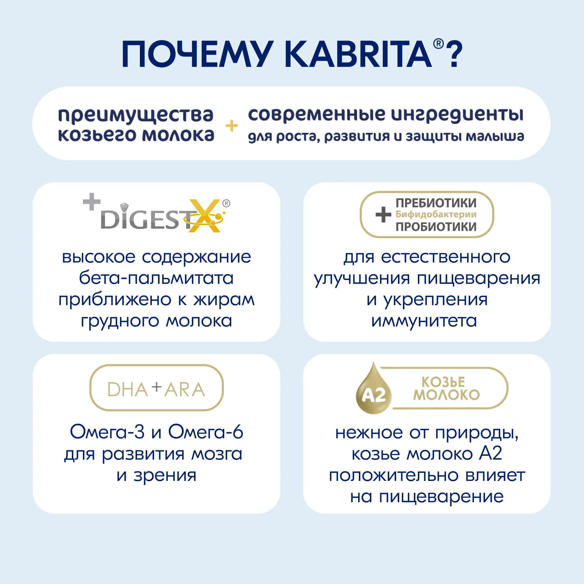 Благодаря голландским фермерским традициям и многолетнему опыту производства (с 1897 года), Kabrita® предлагает современное высококачественное детское питание из козьего молока. Нежное от природы, козье молоко является отличной основой для производства детского питания. Козье молоко переваривается и усваивается быстрее и легче коровьего, что помогает более легкому и комфортному пищеварению. Kabrita® – это преимущества козьего молока и современные функциональные ингредиенты для роста, развития и защиты малыша.
