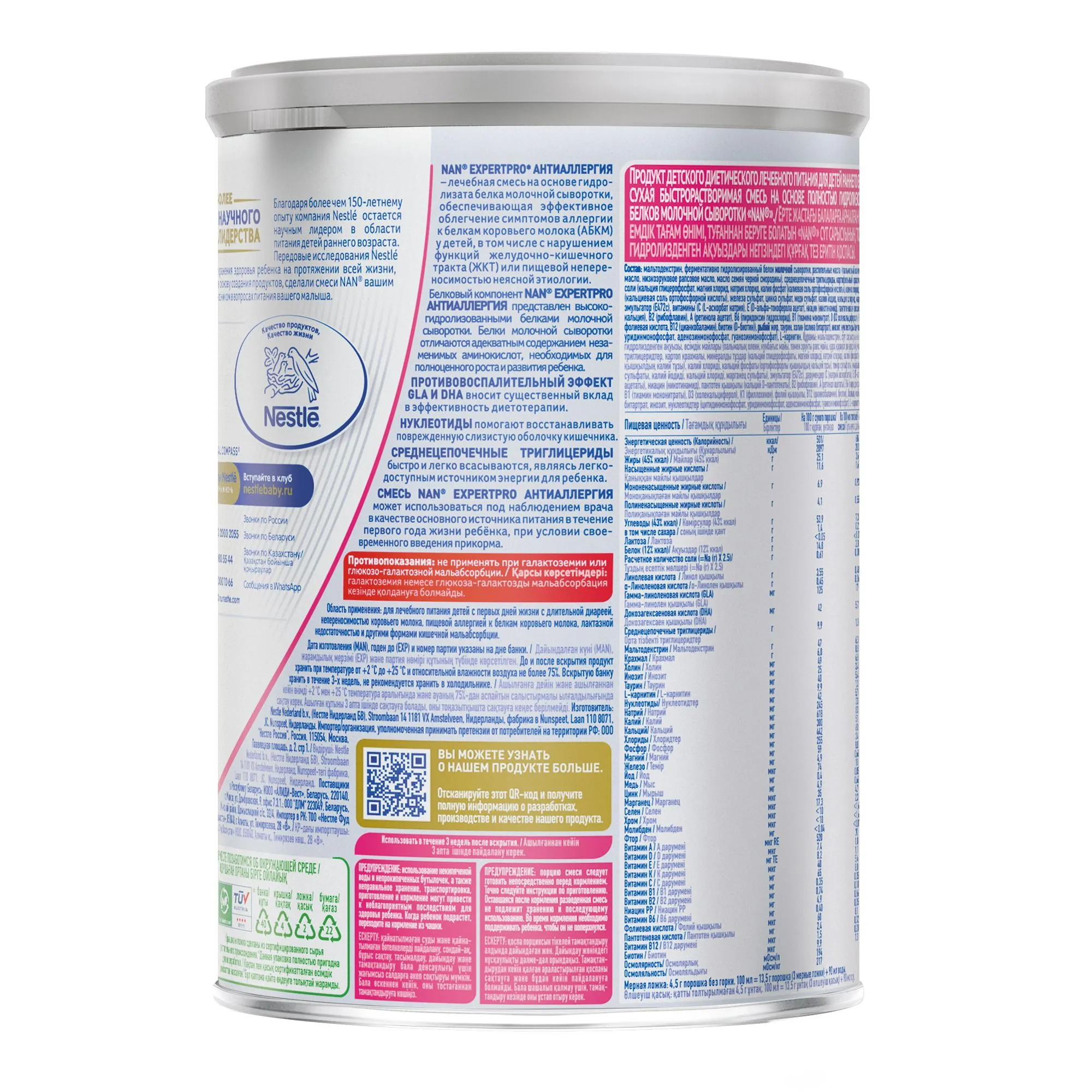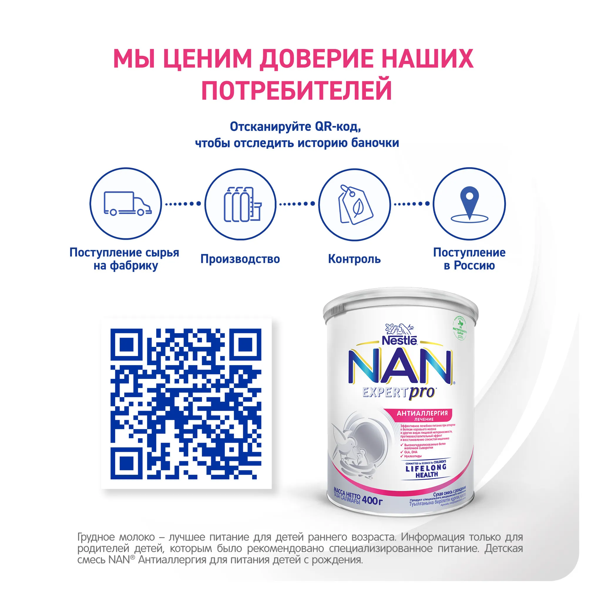 Смесь NAN® EXPERTPRO Антиаллергия – лечебная смесь на основе гидролизата белка молочной сыворотки, обеспечивающая эффективное облегчение симптомов аллергии к белкам коровьего молока (АБКМ) у детей, в том числе, с нарушением функций желудочно-кишечного тракта (ЖКТ) или пищевой непереносимостью неясной этиологии.