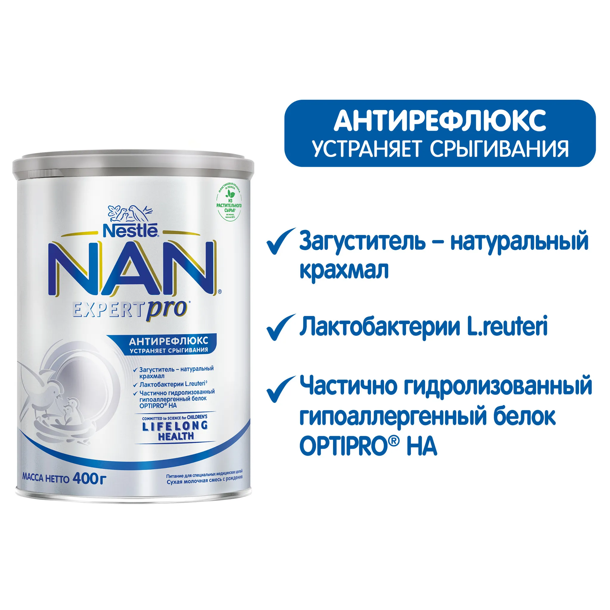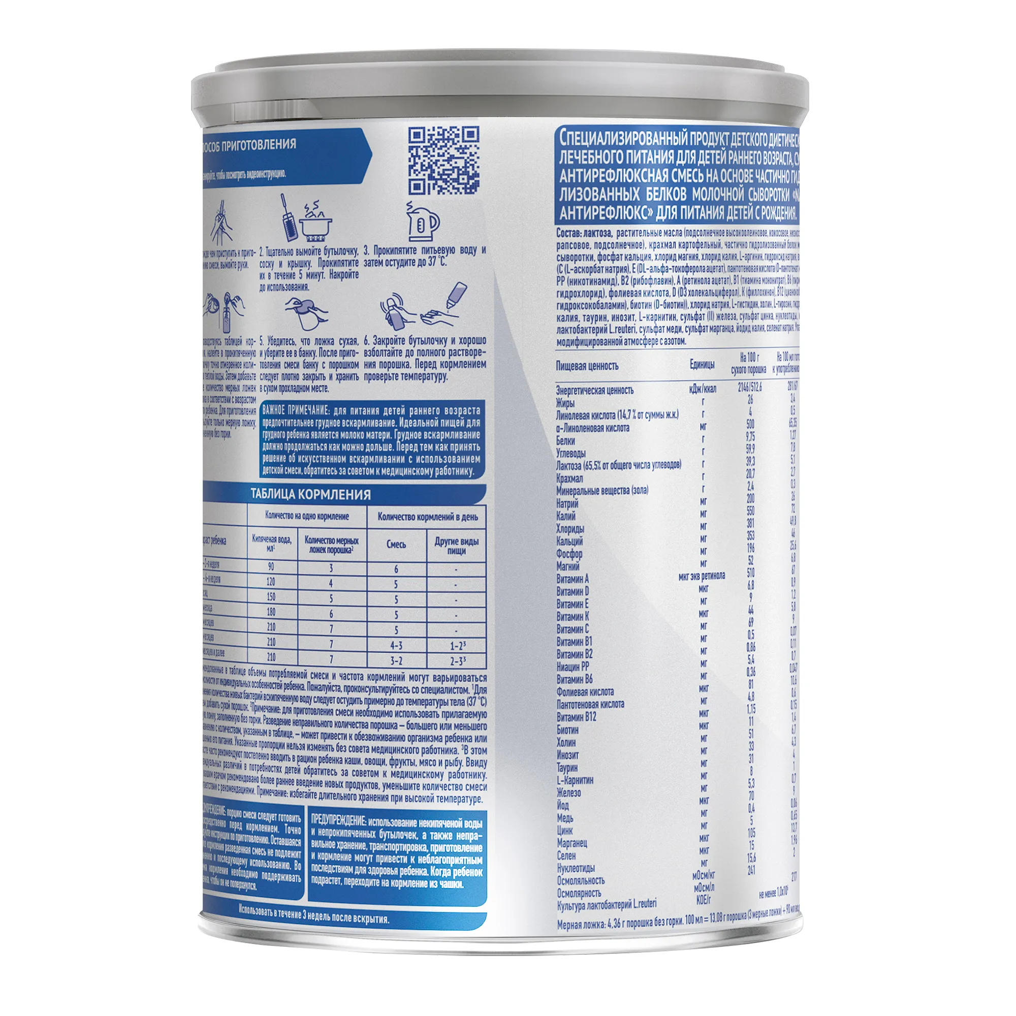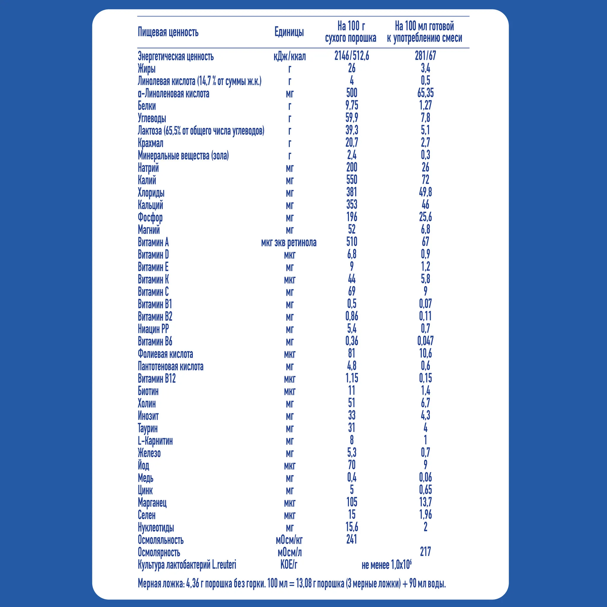 Лактоза, растительные масла (подсолнечное высокоолеиновое, кокосовое, низкоэруковое рапсовое, подсолнечное), крахмал картофельный, частично гидролизованный белок молочной сыворотки, фосфат кальция, хлорид магния, хлорид калия, L-аргинин, гидроксид натрия, витамины (L-аскорбат натрия (C), ниацин (PP), DL-альфа-токоферола ацетат (E), рибофлавин (B2), ретинола ацетат (A), тиамина мононитрат (B1), пиридоксин гидрохлорид (B6), фолиевая кислота, холекальциферол (Д3), фитоменадион (К), цианкобаламин (В12), D-биотин), хлорид натрия, L-гистидин, холин, L-тирозин, гидросульфат калия, таурин, инозит, L-карнитин, сульфат железа (II), сульфат железа, сульфат цинка, нуклеотиды, лактобактерий L.Reuteri (не менее 10^6 КОЕ/г), сульфат меди, сульфат марганца, йодид калия, селенат натрия.