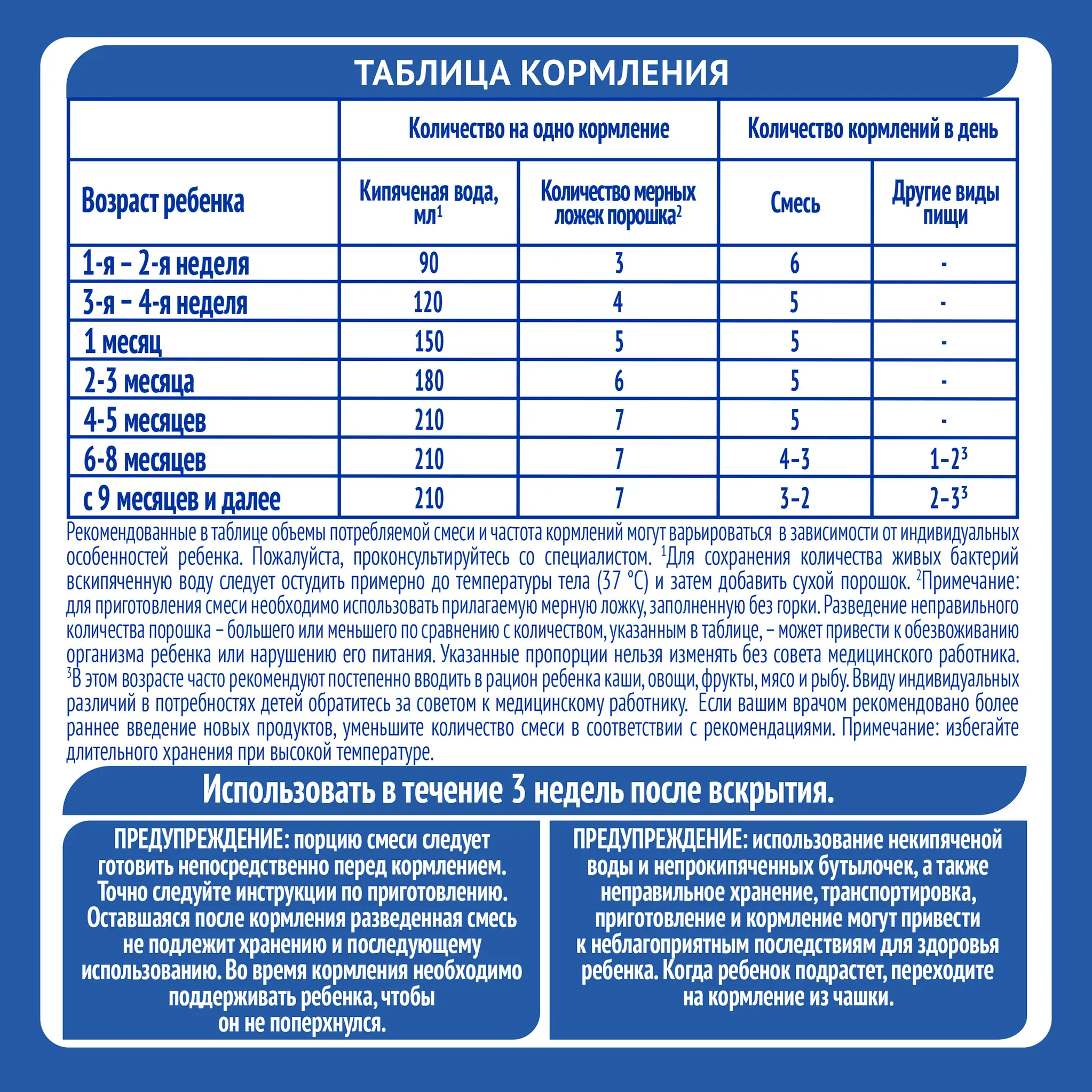 Рекомендованные в таблице объемы потребляемой смеси и частота кормлений могут варьироваться в зависимости от индивидуальных особенностей ребенка. Обратитесь за советом к медицинскому работнику.