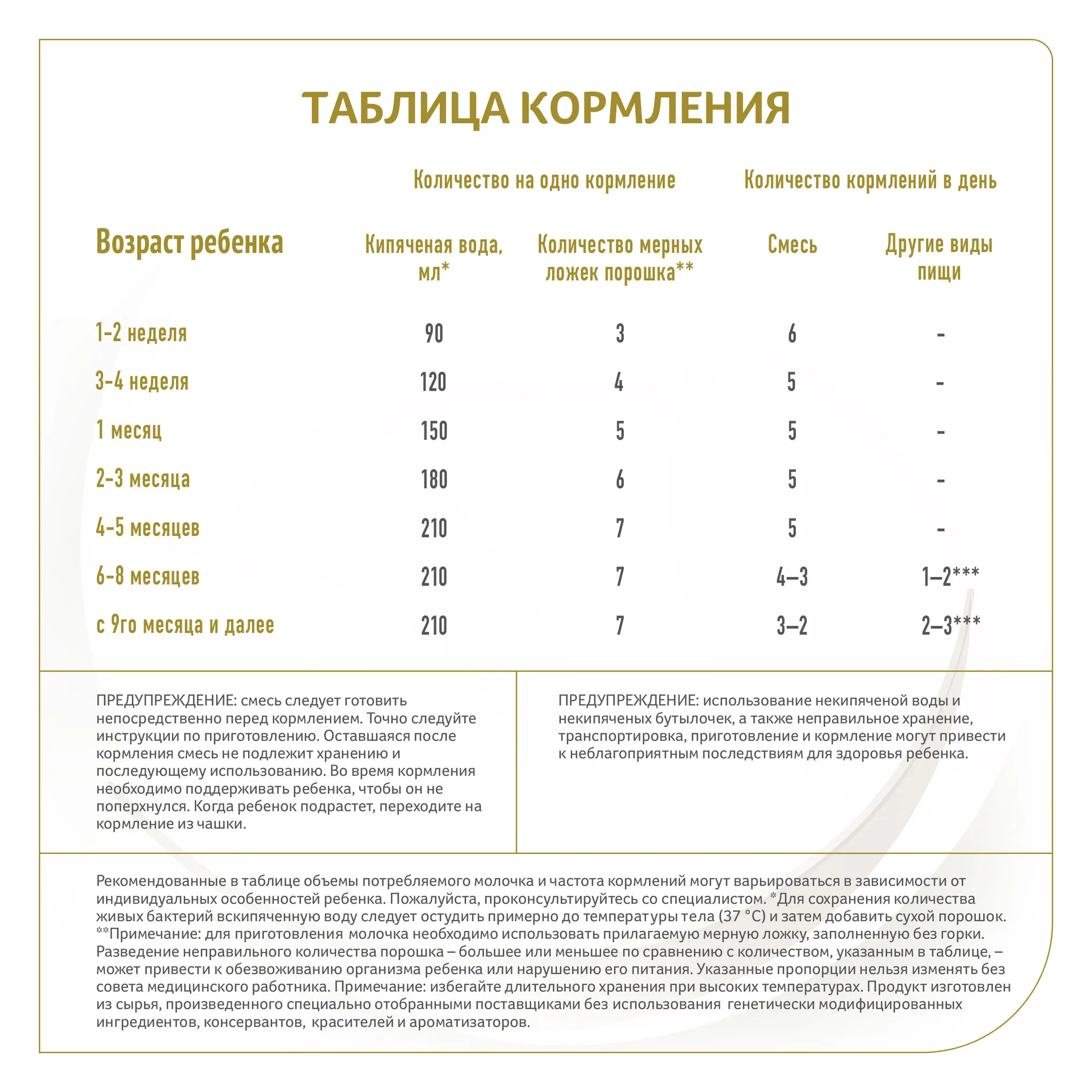 Cмесь следует готовить непосредственно перед кормлением. Точно следуйте инструкции по приготовлению. Оставшаяся после кормления смесь не подлежит хранению и последующему использованию. Во время кормления необходимо поддерживать ребенка, чтобы он не поперхнулся. Когда ребенок подрастет, переходите на кормление из чашки. Использование некипяченой воды и некипяченых бутылочек, а также неправильное хранение, транспортировка, приготовление и кормление могут привести к неблагоприятным последствиям для здоровья ребенка.