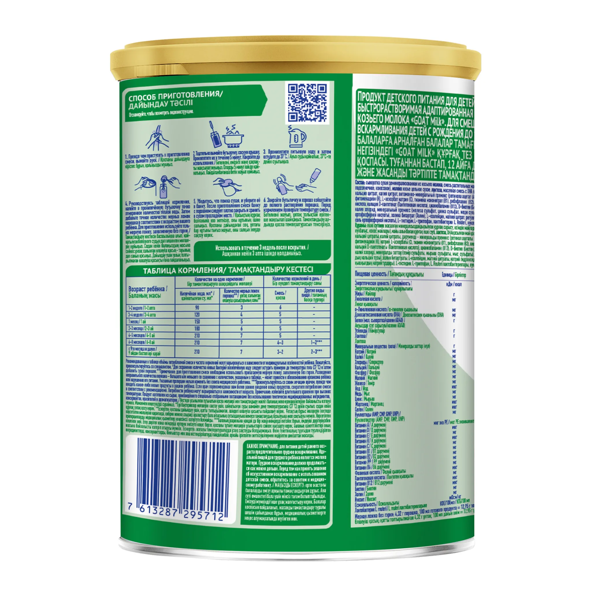 Сыворотка сухая деминерализованная из козьего молока, смесь растительных масел (подсолнечное высокоолеиновое, рапсовое низкоэруковое, подсолнечное, кокосовое), молоко козье цельное сухое, лактоза, масляная смесь с DHA (подсолнечное масло, рыбий жир), эмульгатор соевый лецитин, цитрат кальция, цитрат калия, смесь витаминов (ретинола ацетат (А), D3 холекальциферол (D),DL- альфа токоферол ацетат (Е), фитоменадион (К1), L-аскорбат натрия (С), тиамина мононитрат (В1), рибофлавин (В2), никотинамид (PP), пиридоксин гидрохлорид (В6), фолиевая кислота, кальция D-пантотенат (В5), цианкобаламин (В12), D-биотин, инозит, сульфат марганца, йодид калия, селенат натрия), хлорид калия, минеральные вещества (сульфат железа, сульфат цинка, сульфат меди), L-фенилаланин, кальциевая соль ортофосфорной кислоты (фосфат кальция), холин битартрат, L-изолейцин, цитрат магния, регулятор кислотности гидроксид натрия, натриевые соли ортофосфорной кислоты (фосфат натрия), L-гистидин, L-триптофан, лактобактерии L. Reuteri (не менее 1х106 КОЕ/г), нуклеотиды. Упаковано в модифицированной атмосфере с азотом.