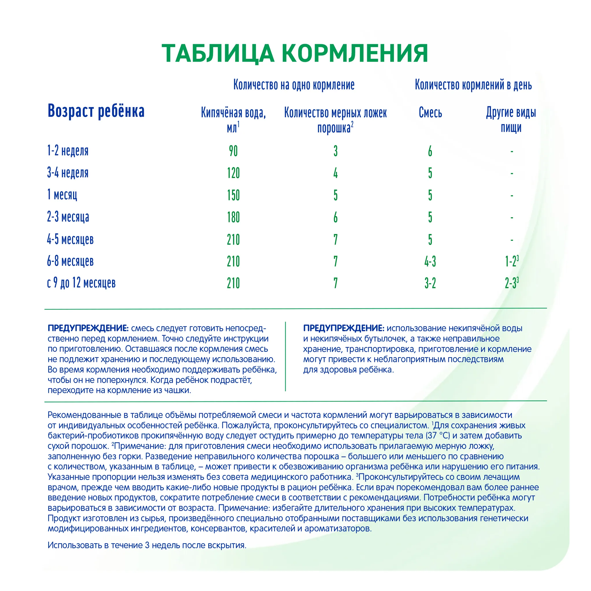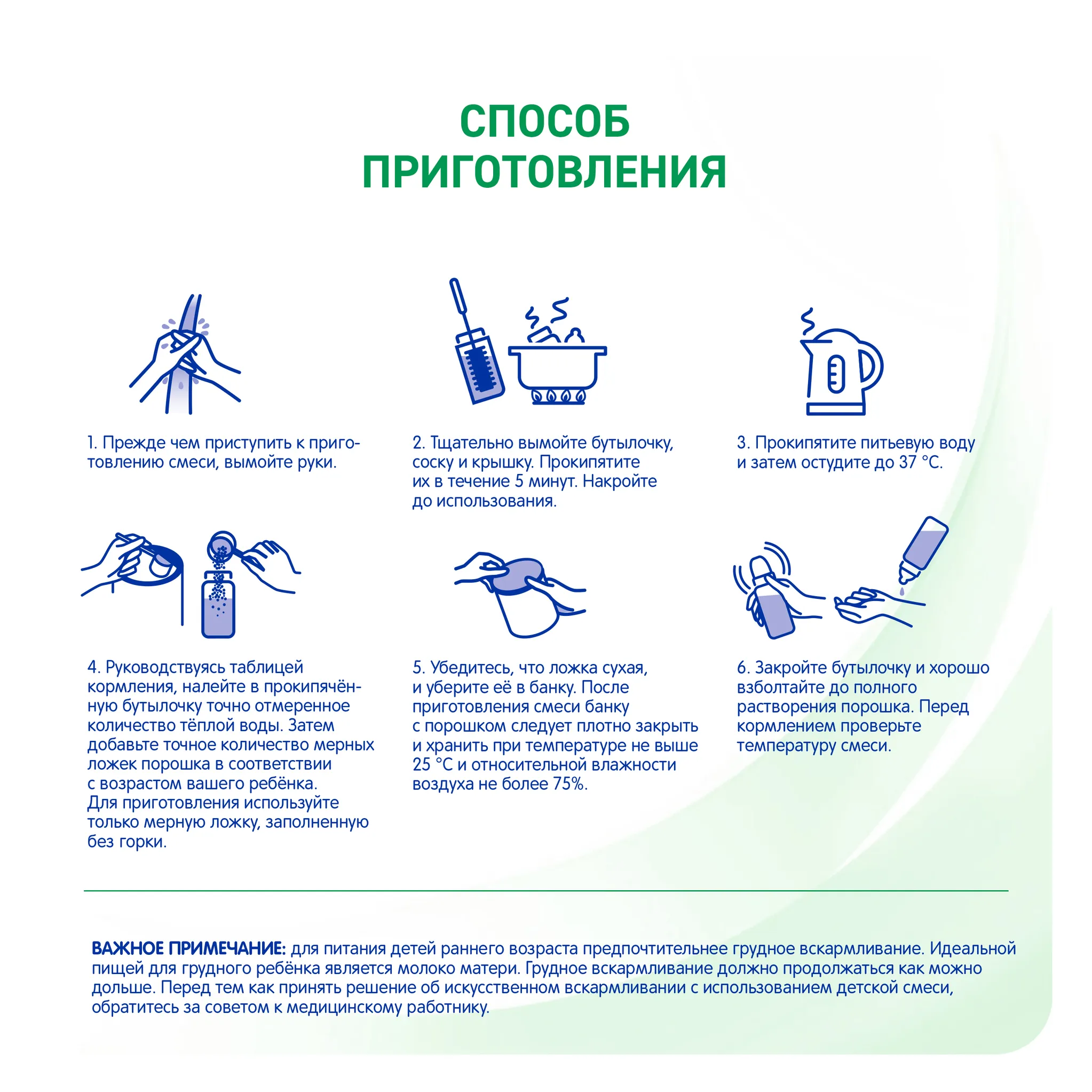 ВАЖНОЕ ПРИМЕЧАНИЕ Для питания детей раннего возраста предпочтительнее грудное вскармливание.Идеальной пищей для грудного ребенка является молоко матери. Грудное вскармливание должно продолжаться как можно дольше. Перед тем как принять решение об искусственном вскармливании с использованием детской смеси, обратитесь за советом к медицинскому работнику.