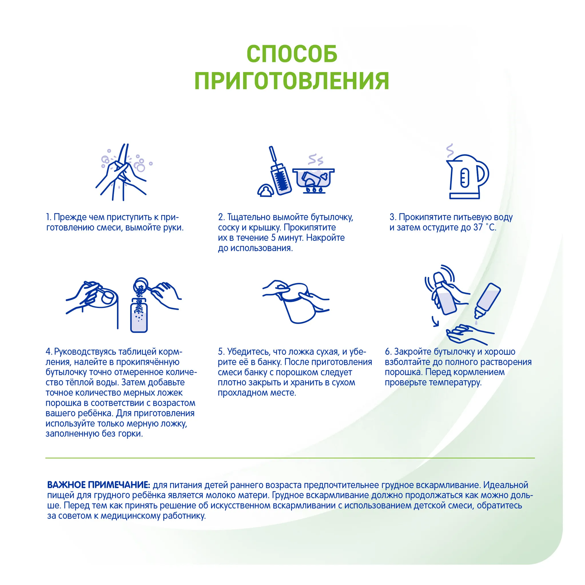 ВАЖНОЕ ЗАМЕЧАНИЕ. Мы считаем, что грудное вскармливание является идеальным началом питания для младенцев и полностью поддерживаем рекомендацию Всемирной организации здравоохранения об исключительно грудном вскармливании в течение первых шести месяцев жизни с последующим введением адекватного питательного прикорма вместе с продолжением грудного вскармливания до двухлетнего возраста. Мы также понимаем, что грудное вскармливание не всегда возможно для родителей, поэтому рекомендуем вам поговорить со своим лечащим врачом о том, как кормить ребенка, и получить совет о том, когда вводить прикорм. Если вы решите не кормить грудью, помните, что такое решение может быть трудно отменить и оно имеет социальные и финансовые последствия. Введение частичного кормления из бутылочки сократит количество грудного молока. Детскую смесь всегда следует готовить, использовать и хранить как указано на этикетке, чтобы избежать риска для здоровья ребенка.