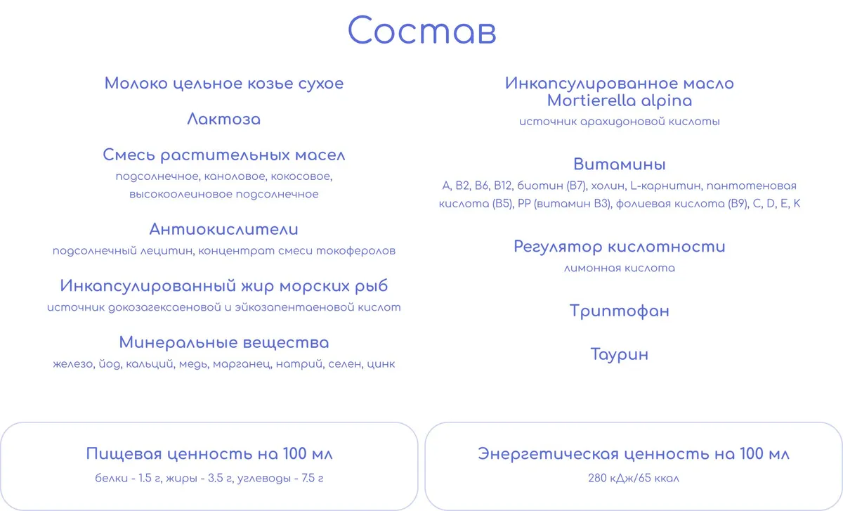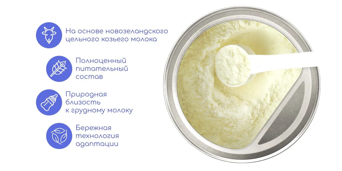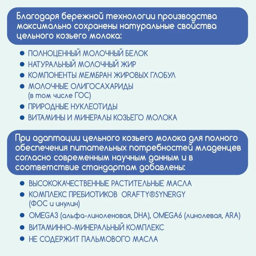 Свойства натурального козьего молока максимально бережно сохранены благодаря специальной технологии производства смеси.