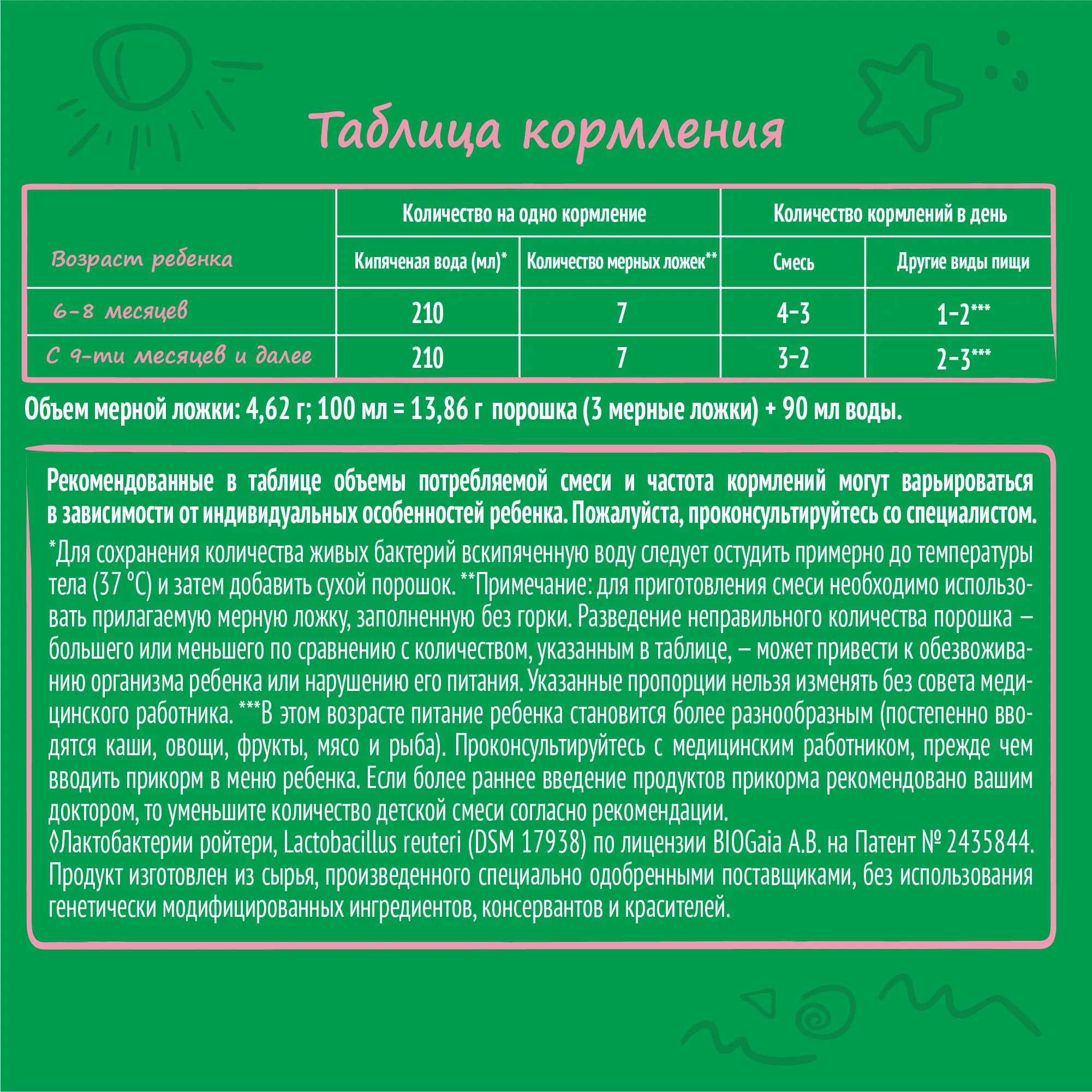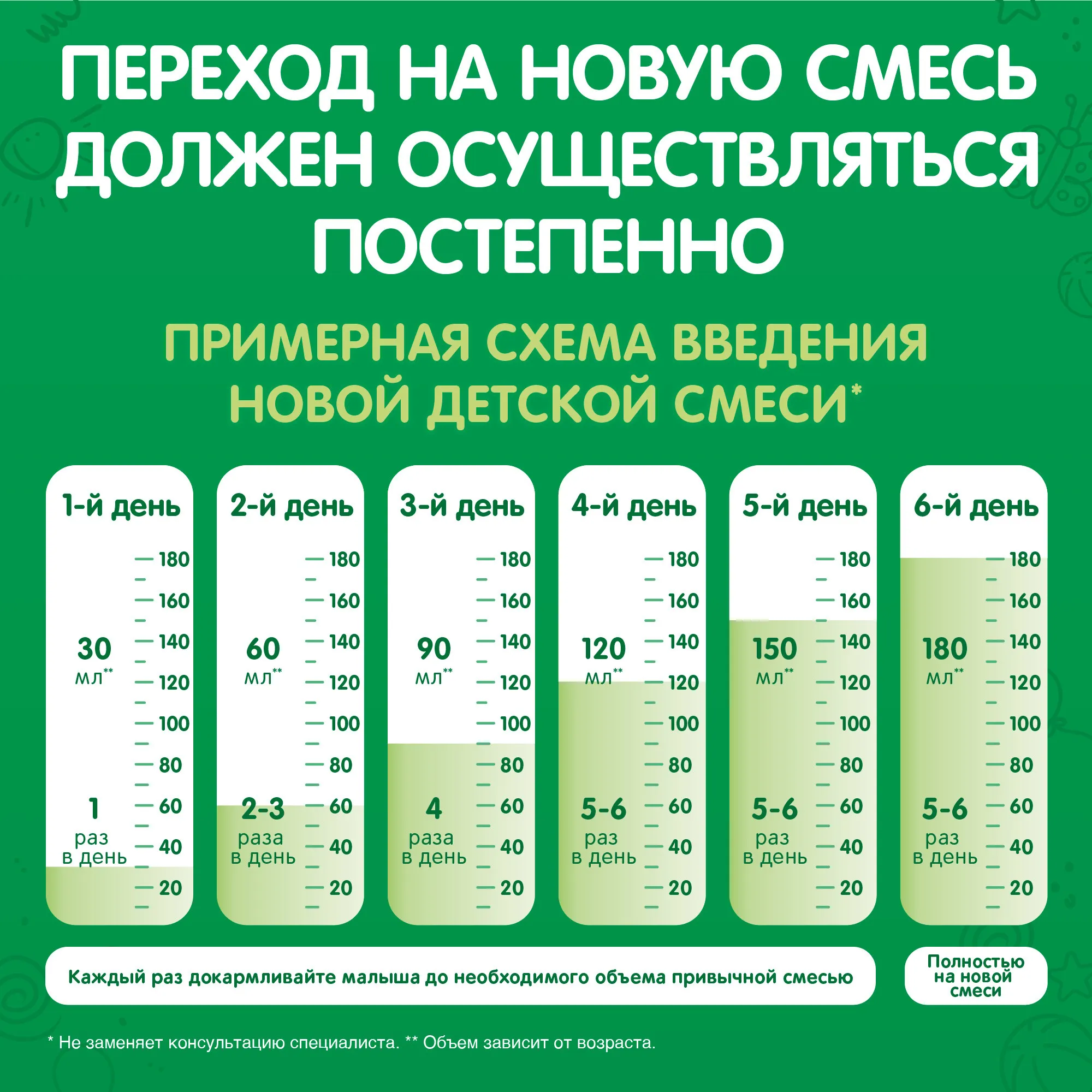 ВАЖНОЕ ЗАМЕЧАНИЕ. Мы считаем, что грудное вскармливание является идеальным началом питания для младенцев и полностью поддерживаем рекомендацию Всемирной организации здравоохранения об исключительно грудном вскармливании в течение первых шести месяцев жизни с последующим введением адекватного питательного прикорма вместе с продолжением грудного вскармливания до двухлетнего возраста. Мы также понимаем, что грудное вскармливание не всегда возможно для родителей, поэтому рекомендуем вам поговорить со своим лечащим врачом о том, как кормить ребенка, и получить совет о том, когда вводить прикорм. Если вы решите не кормить грудью, помните, что такое решение может быть трудно отменить и оно имеет социальные и финансовые последствия. Введение частичного кормления из бутылочки сократит количество грудного молока. Детскую смесь всегда следует готовить, использовать и хранить как указано на этикетке, чтобы избежать риска для здоровья ребенка.