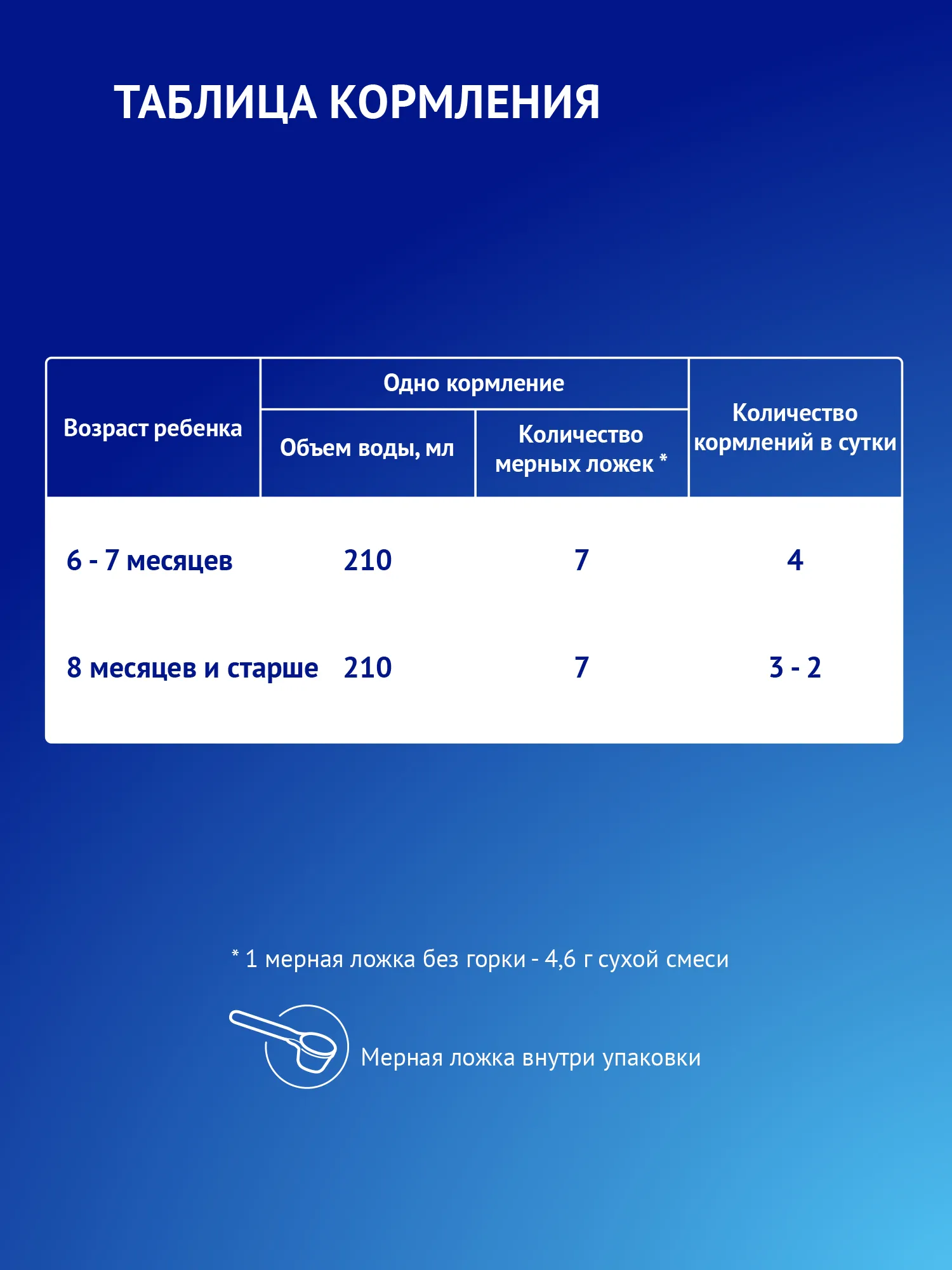 - 8 месяцев и старше : на 1 кормление развести 7 мерных ложки смеси в 210 мл воды. В сутки – 3-2 кормления.