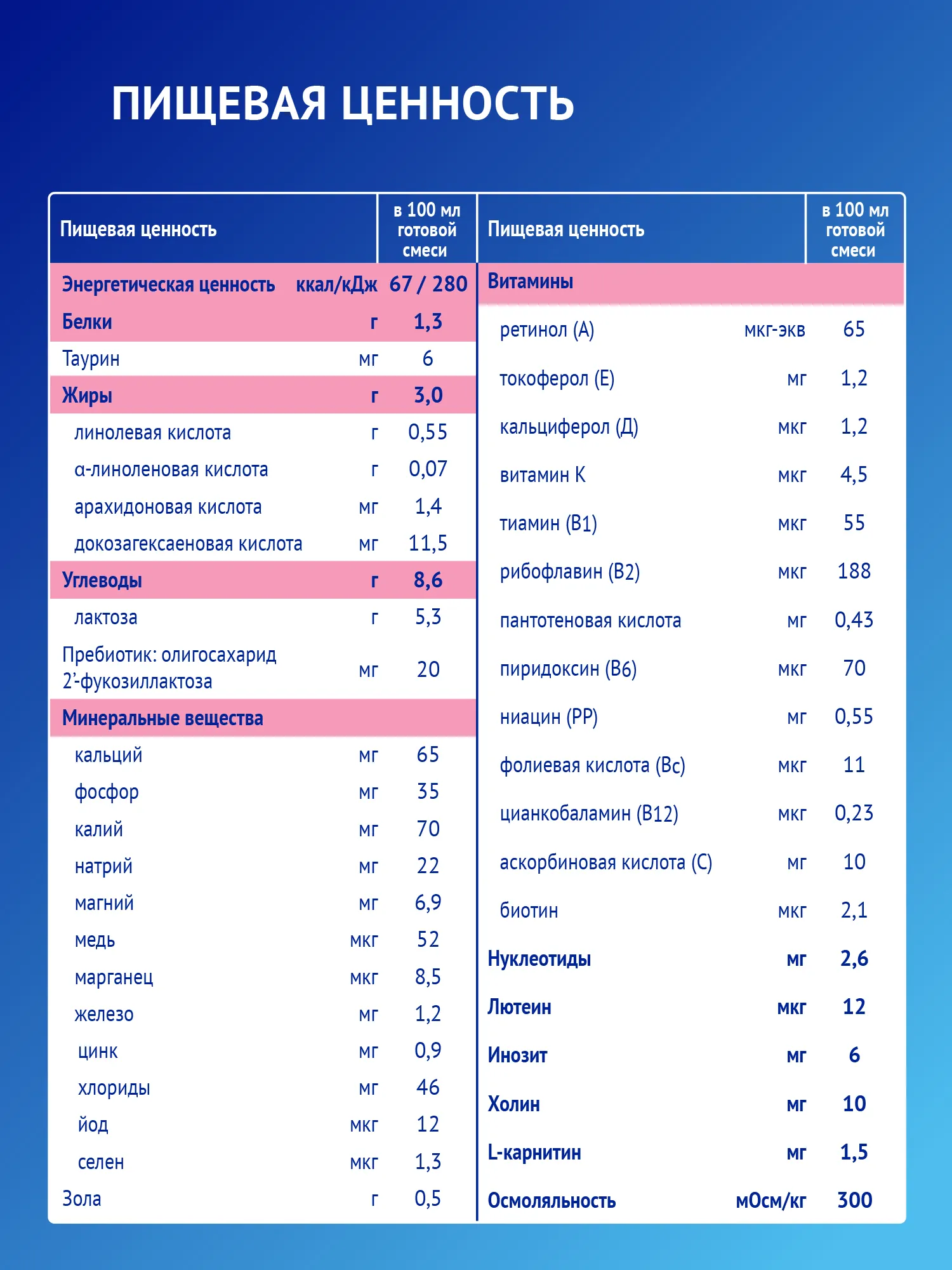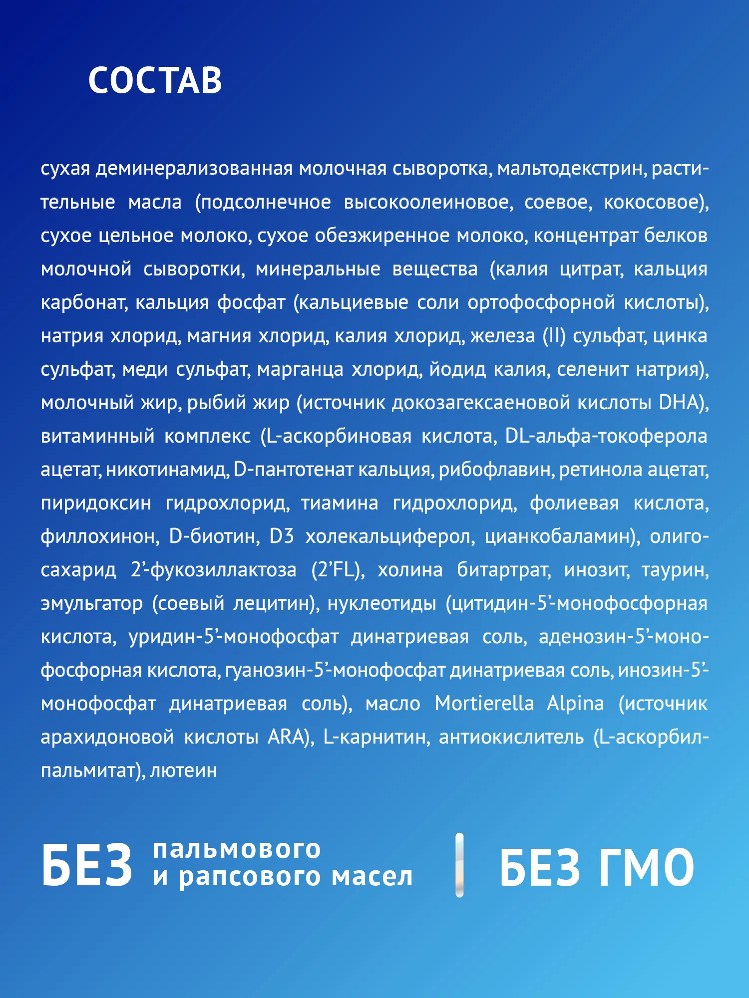сухая деминерализованная молочная сыворотка, мальтодекстрин, растительные масла (подсолнечное высокоолеиновое, соевое, кокосовое), сухое цельное молоко, сухое обезжиренное молоко, концентрат белков молочной сыворотки, минеральные вещества (калия цитрат, кальция карбонат, кальция фосфат, натрия хлорид, магния хлорид, калия хлорид, железа (II) сульфат, цинка сульфат, меди сульфат, марганца хлорид, йодид калия, селенит натрия), молочный жир, рыбий жир (источник докозагексаеновой кислоты DHA), витаминный комплекс (L-аскорбиновая кислота, DL-альфа-токоферола ацетат, никотинамид, D-пантотенат кальция, рибофлавин, ретинола ацетат, пиридоксин гидрохлорид, тиамина гидрохлорид, фолиевая кислота, филлохинон, D-биотин, D3 холекальциферол, цианкобаламин), олигосахарид 2’-фукозиллактоза, холина битартрат, инозит, таурин, эмульгатор (соевый лецитин), нуклеотиды (цитидин-5’-монофосфорная кислота, уридин-5’- монофосфат динатриевая соль, аденозин-5’-монофосфорная кислота, гуанозин-5’-монофосфат динатриевая соль, инозин-5’-монофосфат динатриевая соль), масло Mortierella Alpina (источник арахидоновой кислоты ARA), L-карнитин, антиокислитель (аскорбилпальмитат), лютеин.