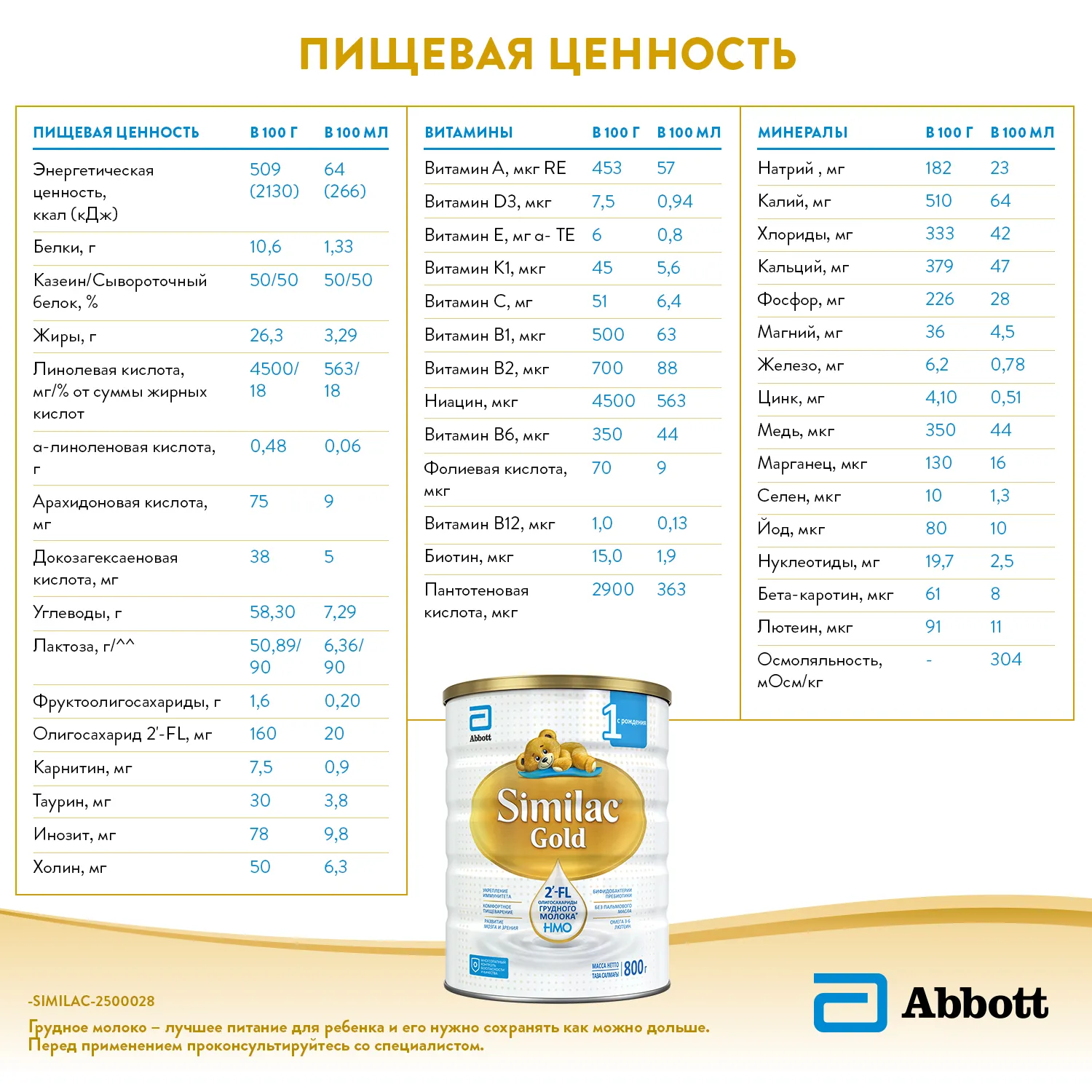 Компания Abbott разработала линейку детских молочных смесей Similac , которые с рождения обеспечивают вашего малыша всем необходимым для здорового роста и полноценного развития. Молочная смесь Similac Gold 1 максимально приближена по составу к грудному молоку (2). Содержит 2'-FL олигосахариды грудного молока*, способствующие укреплению иммунитета (1), бифидобактерии и пребиотики для развития здоровой микрофлоры кишечника, витамины и минералы. Отсутствие