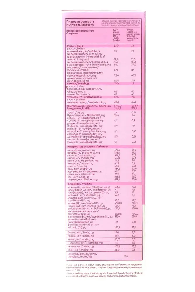 Смесь содержит: - Белковый компонент с преобладанием сывороточных белков (60 %), для оптимального роста и развития; - Нуклеотиды – стимулируют созревание иммунной системы, улучшают рост и развитие клеток слизистой кишечника; - Линолевую и α-линоленовую жирные кислоты, а также DHA и ARA –необходимые для полноценного развития иммунитета, мозга и органа зрения ребенка; - Углеводный компонент представлен мальтодекстрином, не содержит лактозы; - Комплекс иммунонутриентов (цинк, йод, селен, нуклеотиды) и антиоксидантов, необходимых для оптимального роста и развития ребенка.