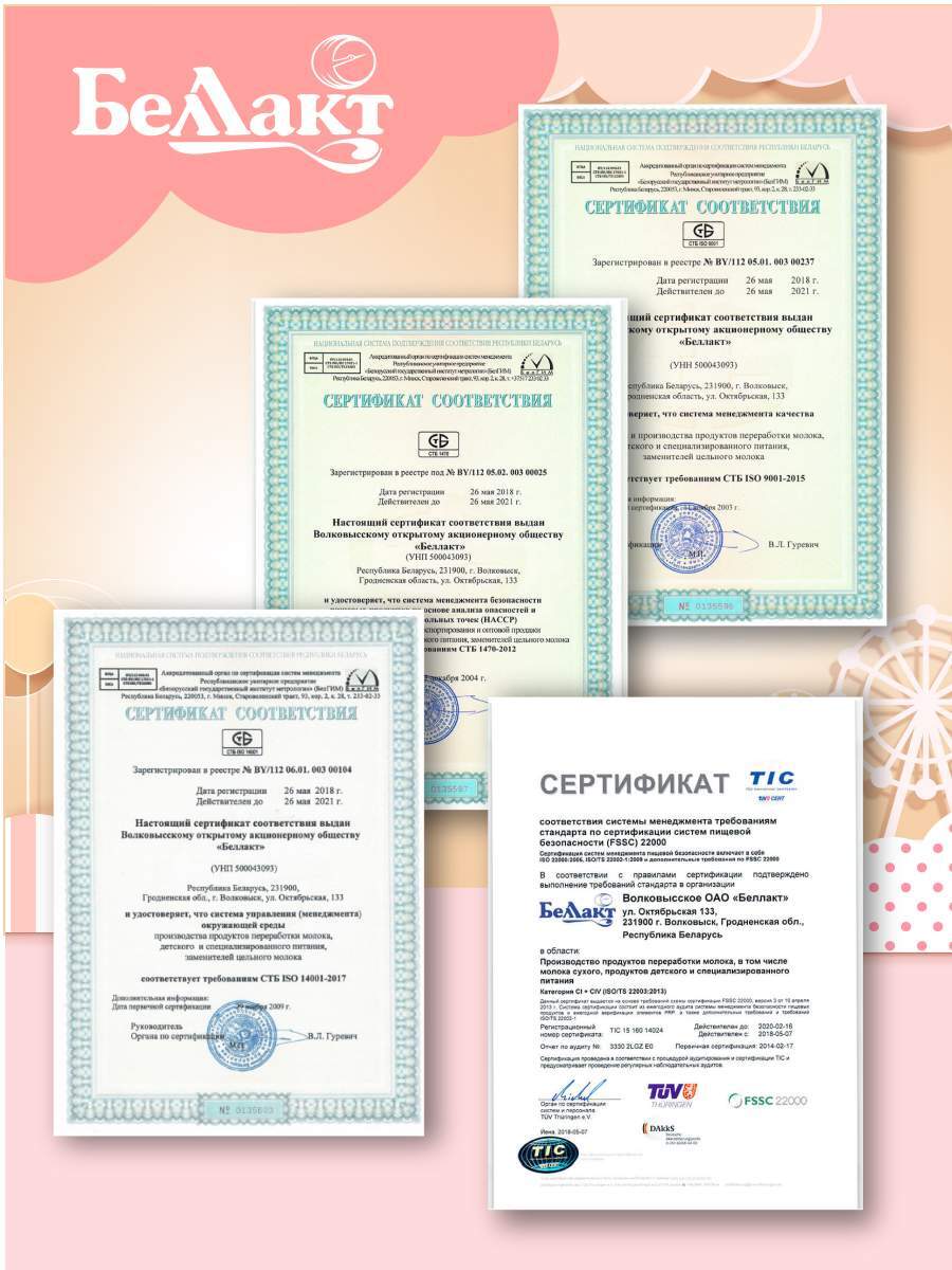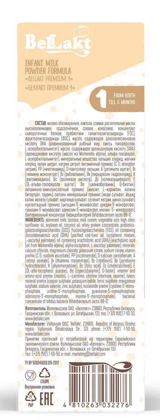 Молоко обезжиренное; лактоза; сливки; растительные масла; высокоолеиновое подсолнечное, соевое, кокосовое; концентрат сывороточных белков; пребиотики: олигогалактоза (ГОС), олигофруктоза (ФОС); масло, содержащее докозагексаеновую кислоту DHA (рафинированный рыбий жир, смесь токоферолов, аскорбил пальмитат); масло, содержащее арахидоновую кислоту (ARA); минеральные вещества: кальция лактат, магния хлорид, калия цитрат, натрия цитрат; витаминный премикс; С (L-аскорбат натрия), РР (никотинамид). D-пантотенат кальция. А (ретинола ацетат). В1 (тиамина мононитрат), В2 (рибофлавин). В6 (пиридоксин гидрохлорид). К (фитоменадион), Вс (фолиевая кислота). Д3 (холекальциферол). Е (D-альфа-токоферол). B12 (цианкобаламин). D-биотин. витаминно-аминокислотный премикс; инозит. L-карнитин, холин, таурин; лютеин; минеральный премикс; меди сульфат, йодид калия, железа сульфат, марганца сульфат, натрия селенит, цинка сульфат; нуклеотидный премикс; цитидин-5'-монофосфат, уридин-5'-монофосфат, гуанозин-5'- монофосфат, аденозин-5-монофосфат, инозин-5'-монофосфат; бактериальный концентрат бифидобактерий Bifidobacterium lactis BB-12