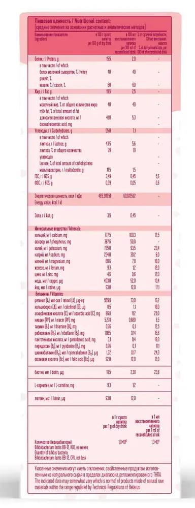 Молоко обезжиренное, лактоза, сливки, мальтодекстрин, растительные масла: высокоолеиновое подсолнечное, соевое, кокосовое, пребиотики: олигогалактоза (ГОС), олигофруктоза (ФОС), концентрат сывороточных белков, масло, содержащее докозагексаеновую кислоту DHA (рафинированный рыбий жир, смесь токоферолов, аскорбил пальмитат), минеральные вещества: кальция лактат, магния хлорид, железа сульфат, натрия цитрат, калия цитрат, цинка сульфат, меди сульфат, йодид калия, витамины: С (L-аскорбиновая кислота), РР (никотинамид), D-пантотенат кальция, В2 (рибофлавин), В6 (пиридоксин гидрохлорид), А (ретинола пальмитат), В1 (тиамина гидрохлорид), Вс (фолиевая кислота), Д3 (холекальциферол), D-биотин, В12 (цианкобаламин), L-карнитин, лютеин, бактериальный концентрат бифидобактерий Bifidobacterium lactis BB-12.