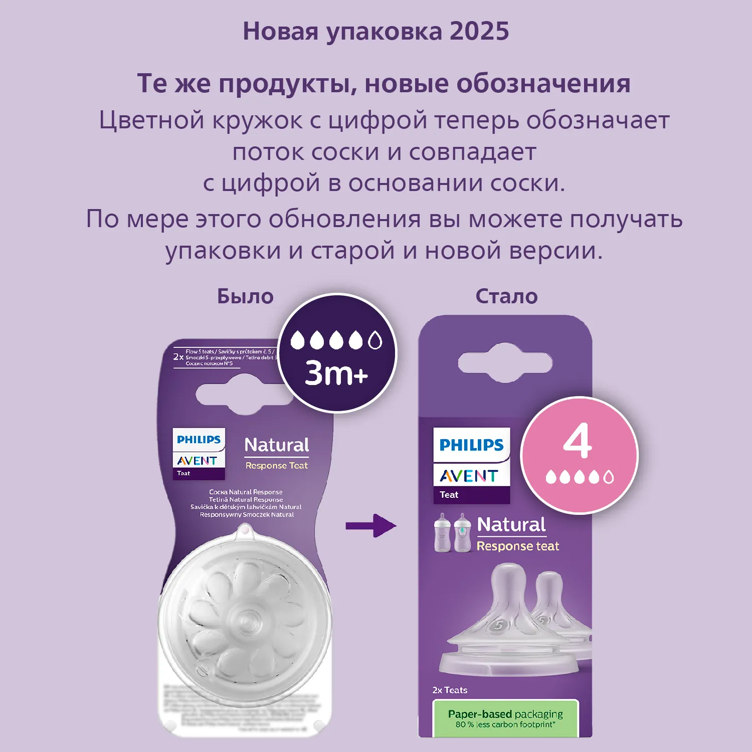 Мы перешли к обозначениям с разными уровнями скорости потока. Попробуйте соску с более медленным потоком, если ребенок давится молоком или оно вытекает у него изо рта. Попробуйте соску с более быстрым потоком, если ребенок играет с соской вместо питья или чем-то недоволен. По мере этого обновления вы можете получать упаковки и старой, и новой версии.