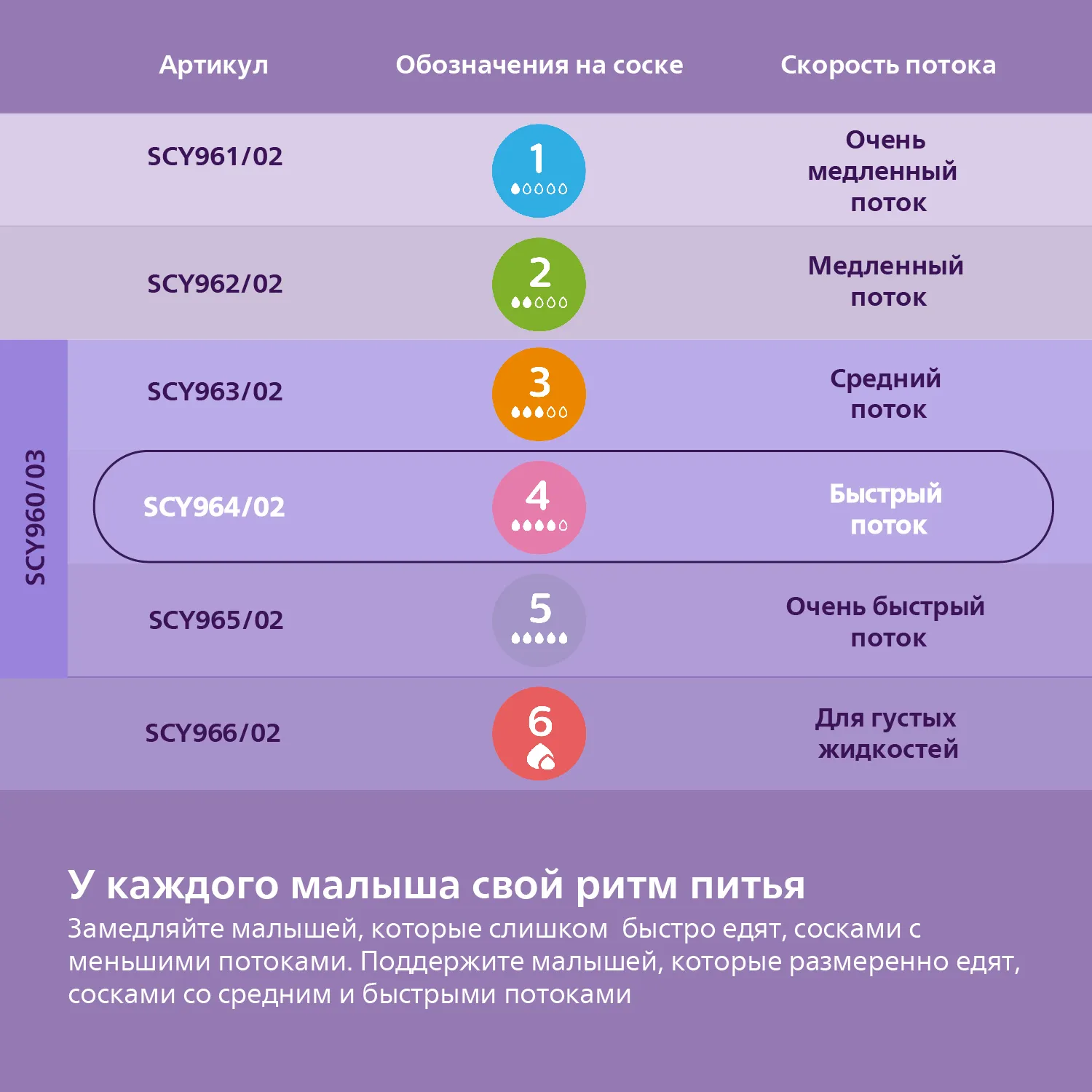 Каждый ребенок уникален. Выбирайте соску вашему малышу с подходящей скоростью потока и легко переключайтесь между сосками по мере роста и развития ребенка. Возраст — это лишь один из критериев выбора, ведь у каждого малыша свой ритм питья.