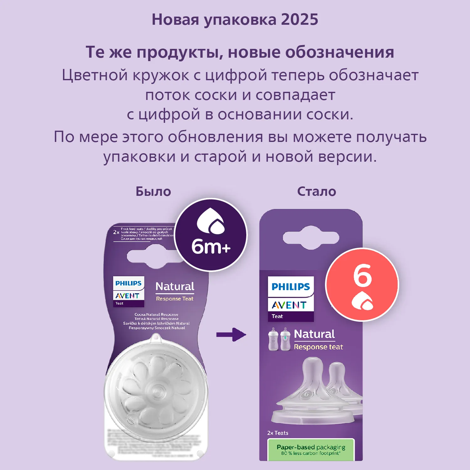 Мы перешли к обозначениям с разными уровнями скорости потока. Попробуйте соску с более медленным потоком, если ребенок давится молоком или оно вытекает у него изо рта. Попробуйте соску с более быстрым потоком, если ребенок играет с соской вместо питья или чем-то недоволен. По мере этого обновления вы можете получать упаковки и старой, и новой версии.