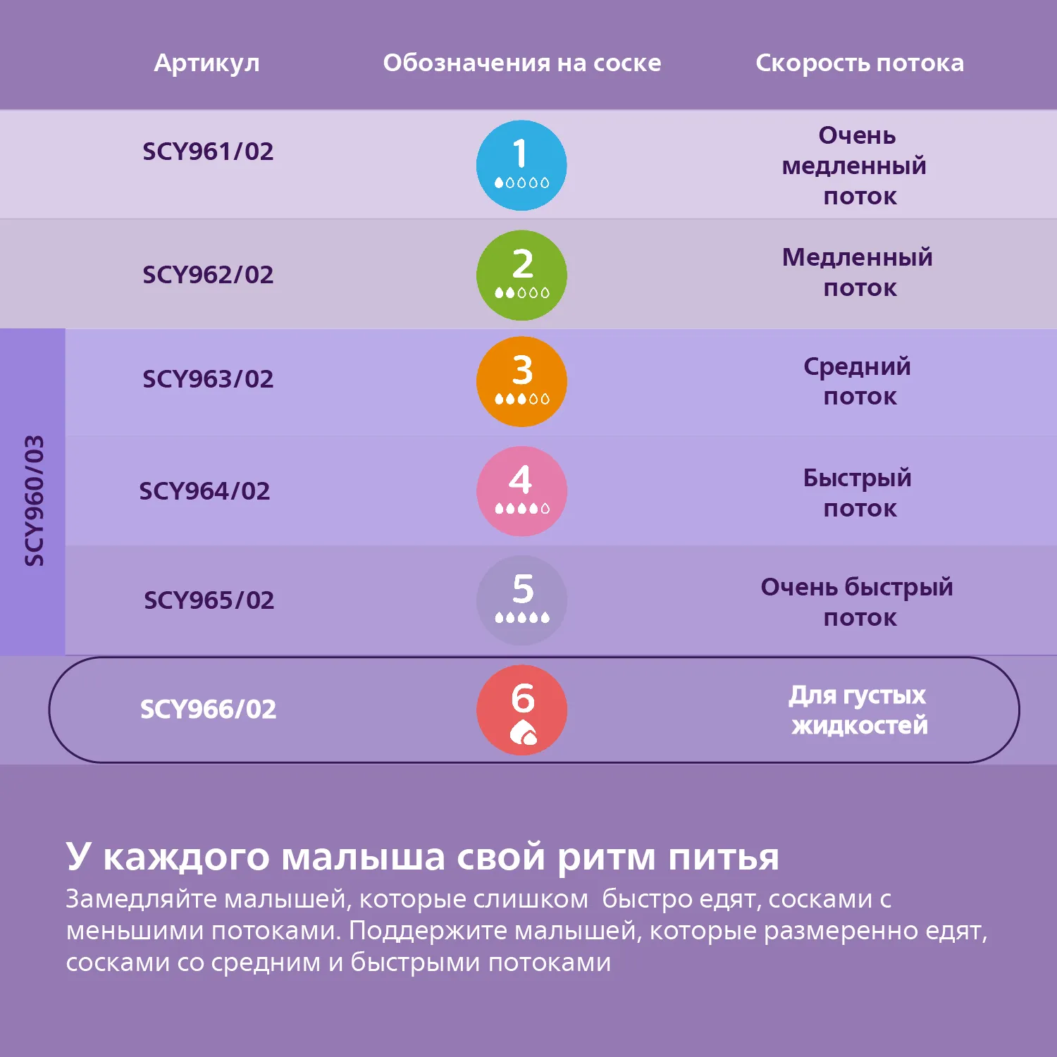 Каждый ребенок уникален. Выбирайте соску вашему малышу с подходящей скоростью потока и легко переключайтесь между сосками по мере роста и развития ребенка. Возраст — это лишь один из критериев выбора, ведь у каждого малыша свой ритм питья.