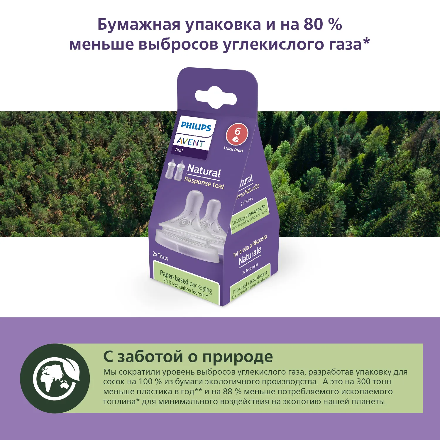 Обновленная ЭКО упаковка. Мы сократили уровень выбросов углекислого газа, разработав упаковку для сосок на 100 % из бумаги экологичного производства. Что в итоге? На 300 тонн меньше пластика в год⁵ и на 88 % меньше потребляемого ископаемого топлива⁶ для минимального воздействия на экологию нашей планеты.