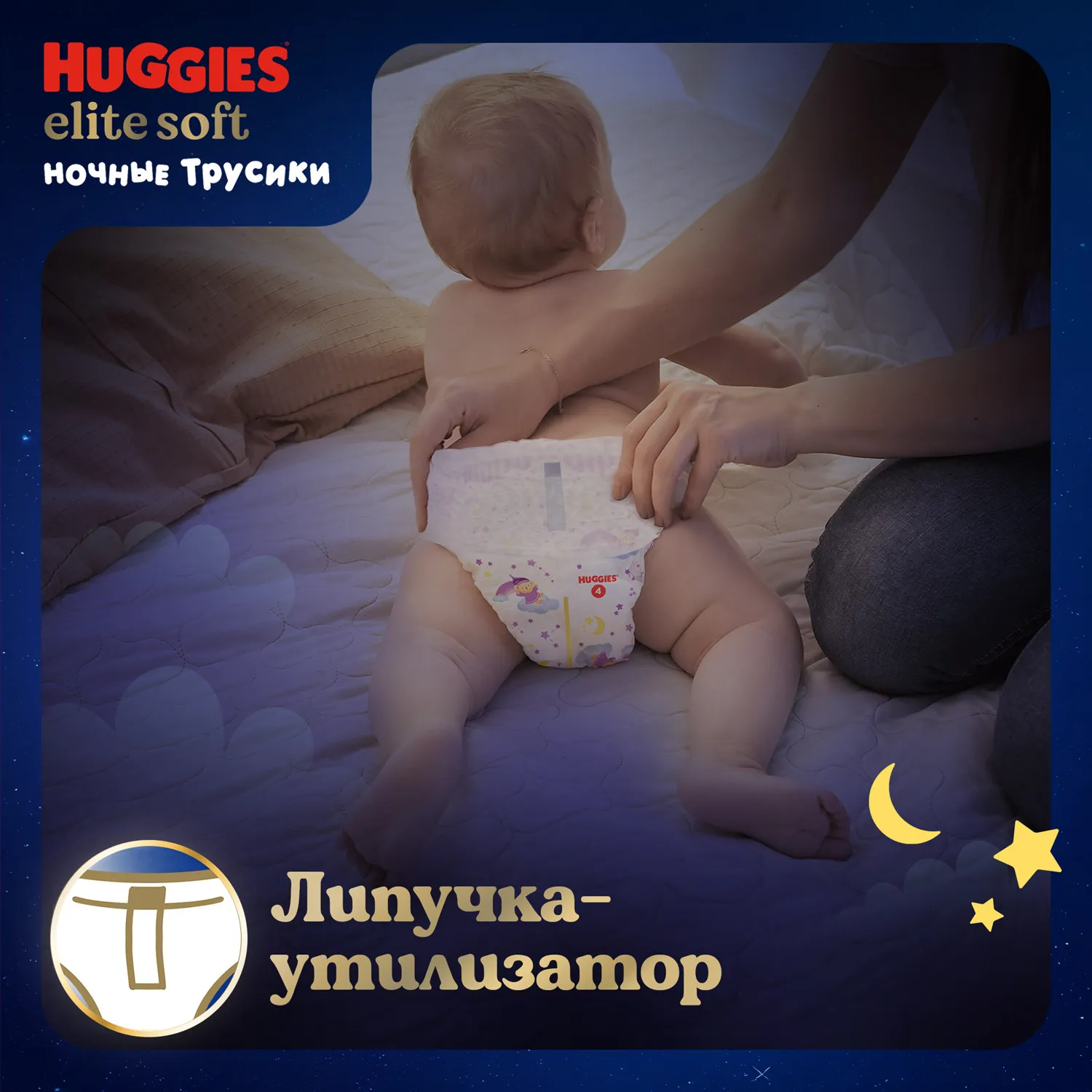 Ночные подгузники трусики Huggies Elite Soft имеют усиленный впитывающий слой, сохраняющий сухость на протяжении всей ночи.
