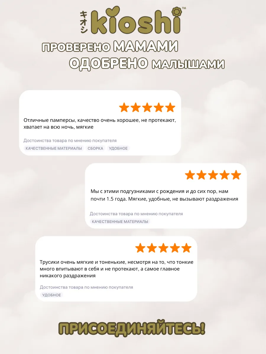 Также у KIOSHI широкая размерная сетка от подгузников для новорожденных до подгузников-трусиков на 16+ кг.