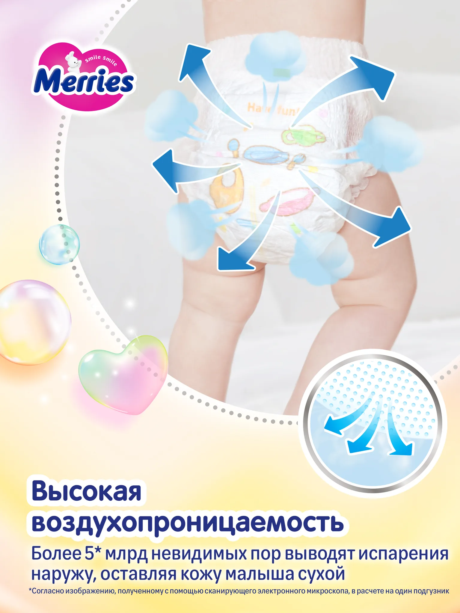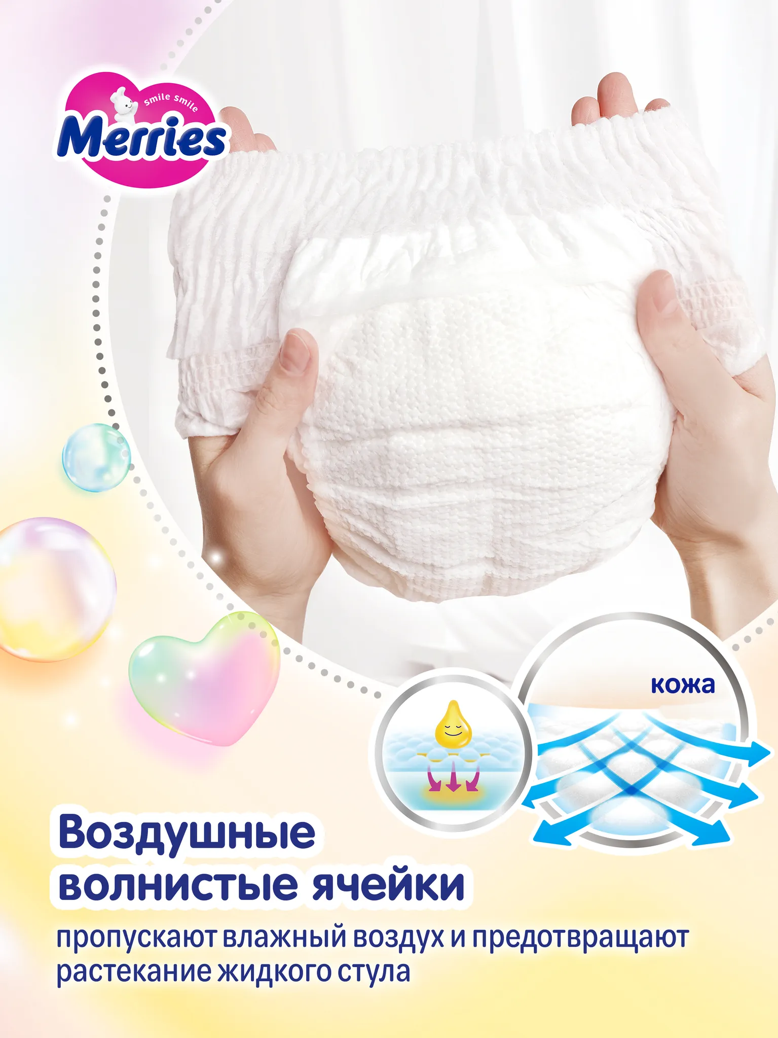 Трусики Merries хорошо подходят как дневные подгузники, когда ребёнок максимально подвижен, так и в качестве ночных подгузников, когда малыш дольше не переодевается.
