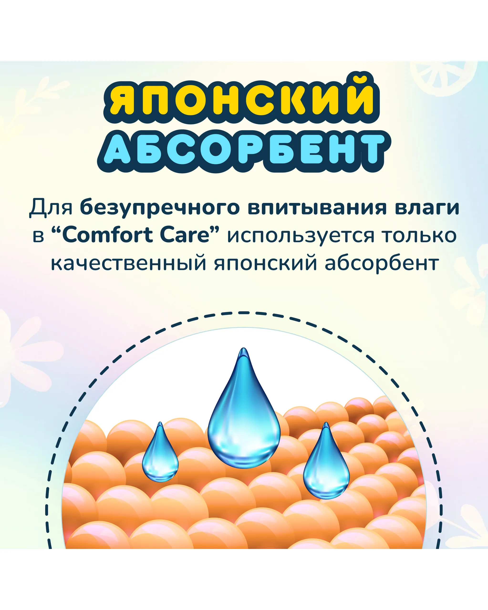 Дизайн подгузников Comfort Care позволяет им оставаться незаметными под одеждой, обеспечивая при этом надежную защиту от протеканий. Высокая воздухопроницаемость подгузников помогает поддерживать кожу малыша сухой и здоровой, предотвращая раздражение.