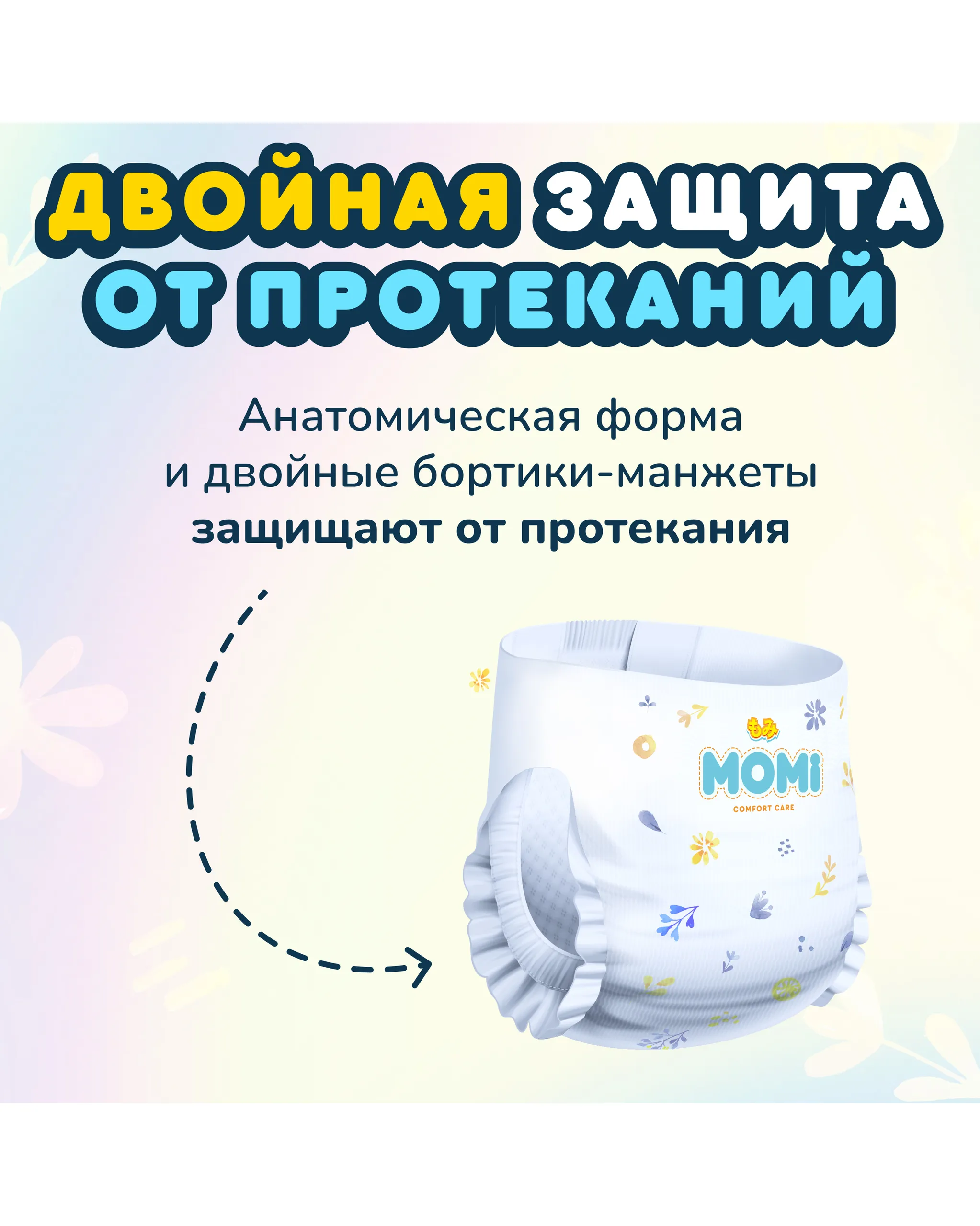 Инновационный дизайн подгузников Momi обеспечивает оптимальную посадку и свободу движений ребенка. Трусики Comfort Care обеспечивают идеальное прилегание и предотвращают протекания.