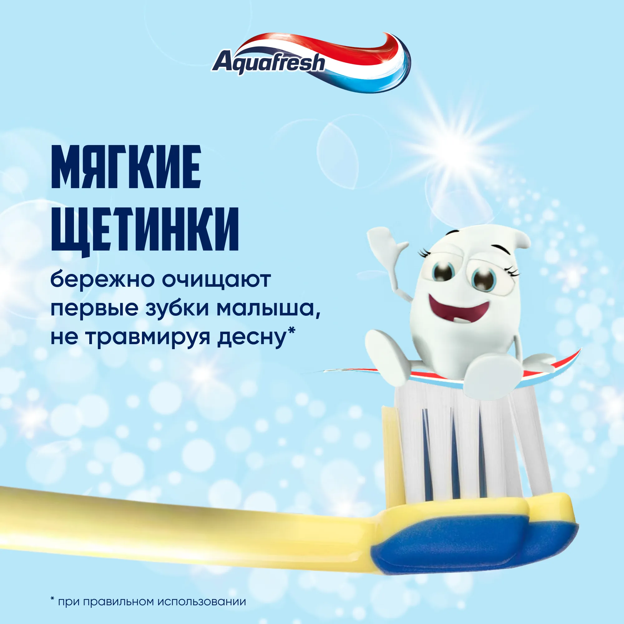 Используйте зубную щетку Aquafresh Мой первый зубик в комплекте с зубной пастой Aquafresh Мой первый зубик для комплексного ухода за полостью рта вашего малыша.
