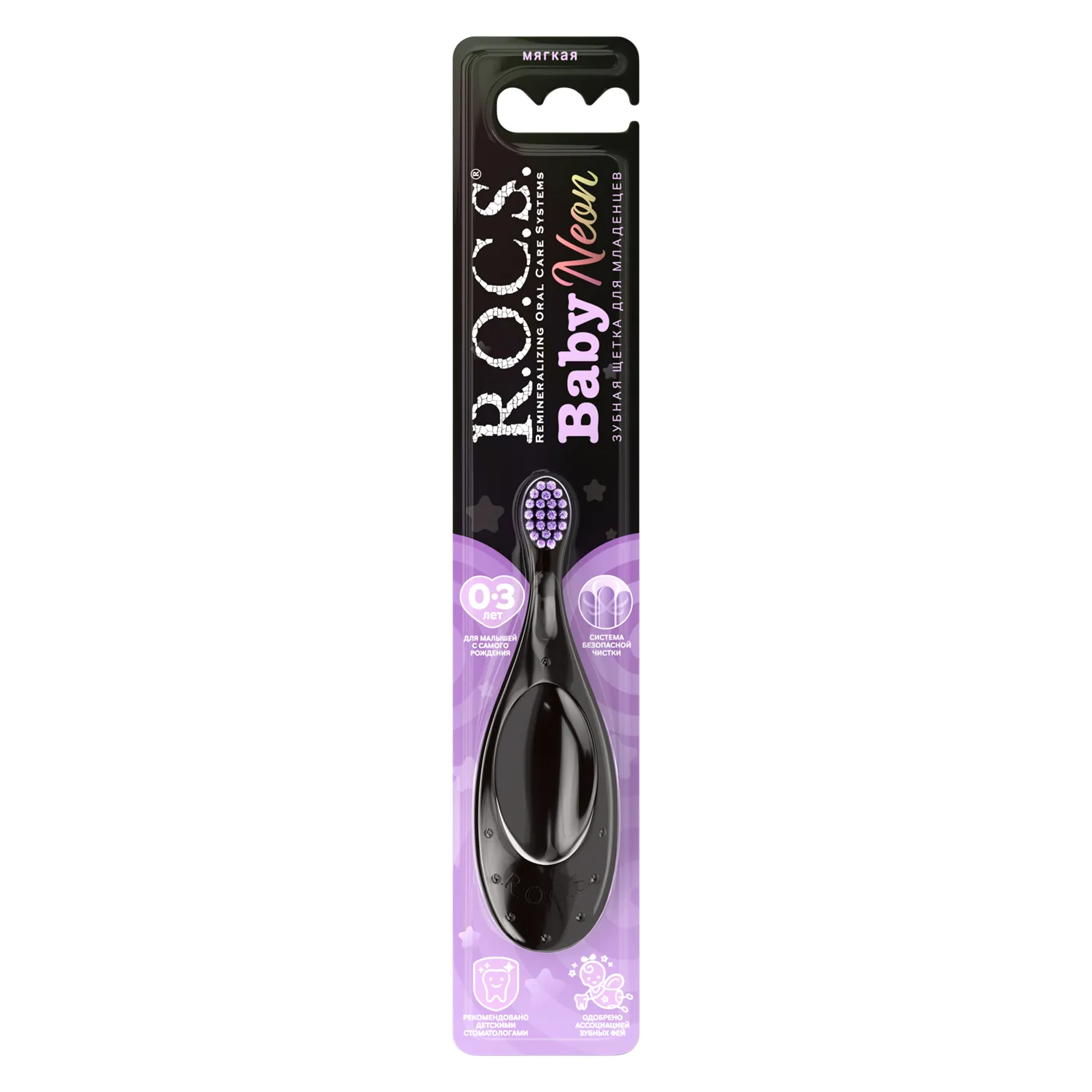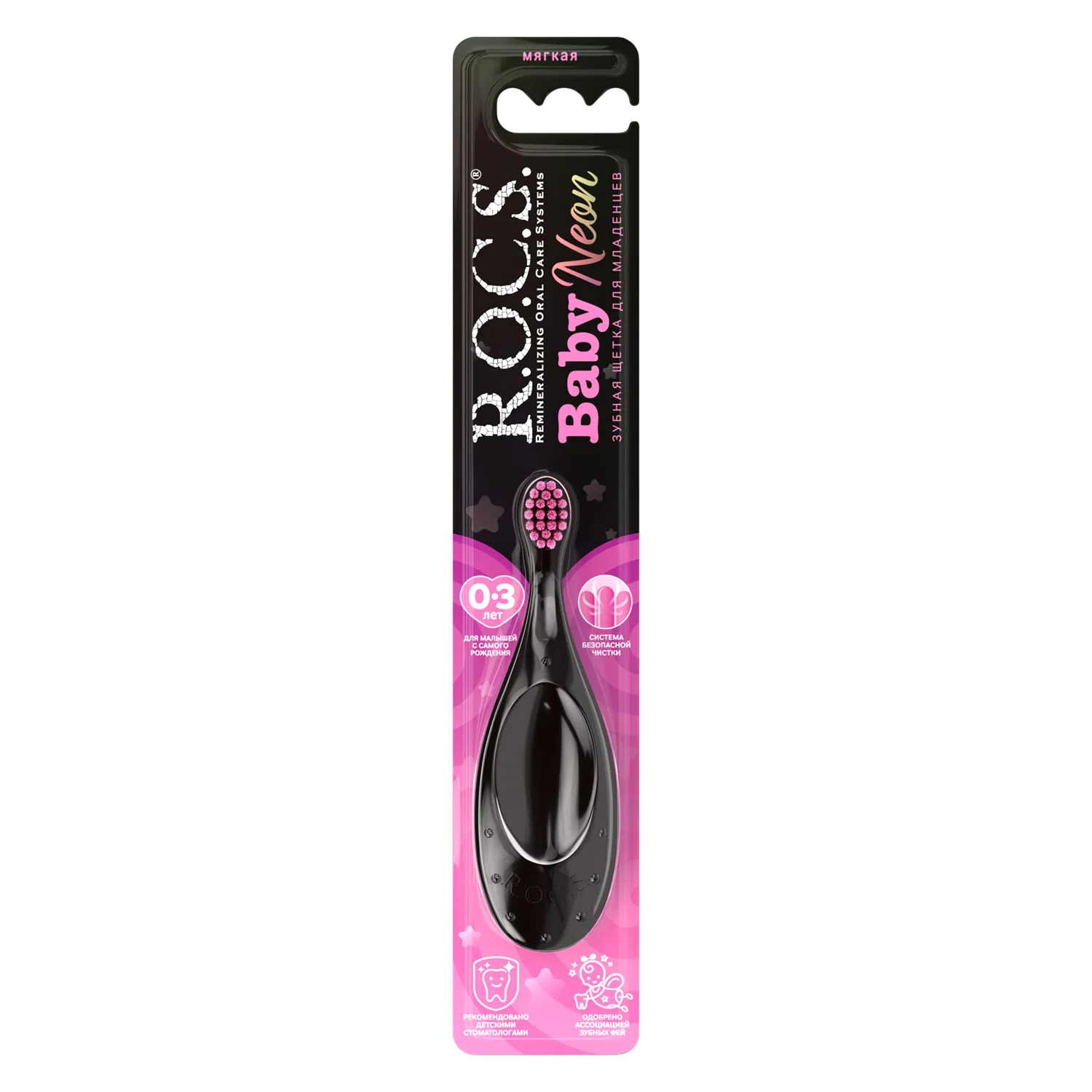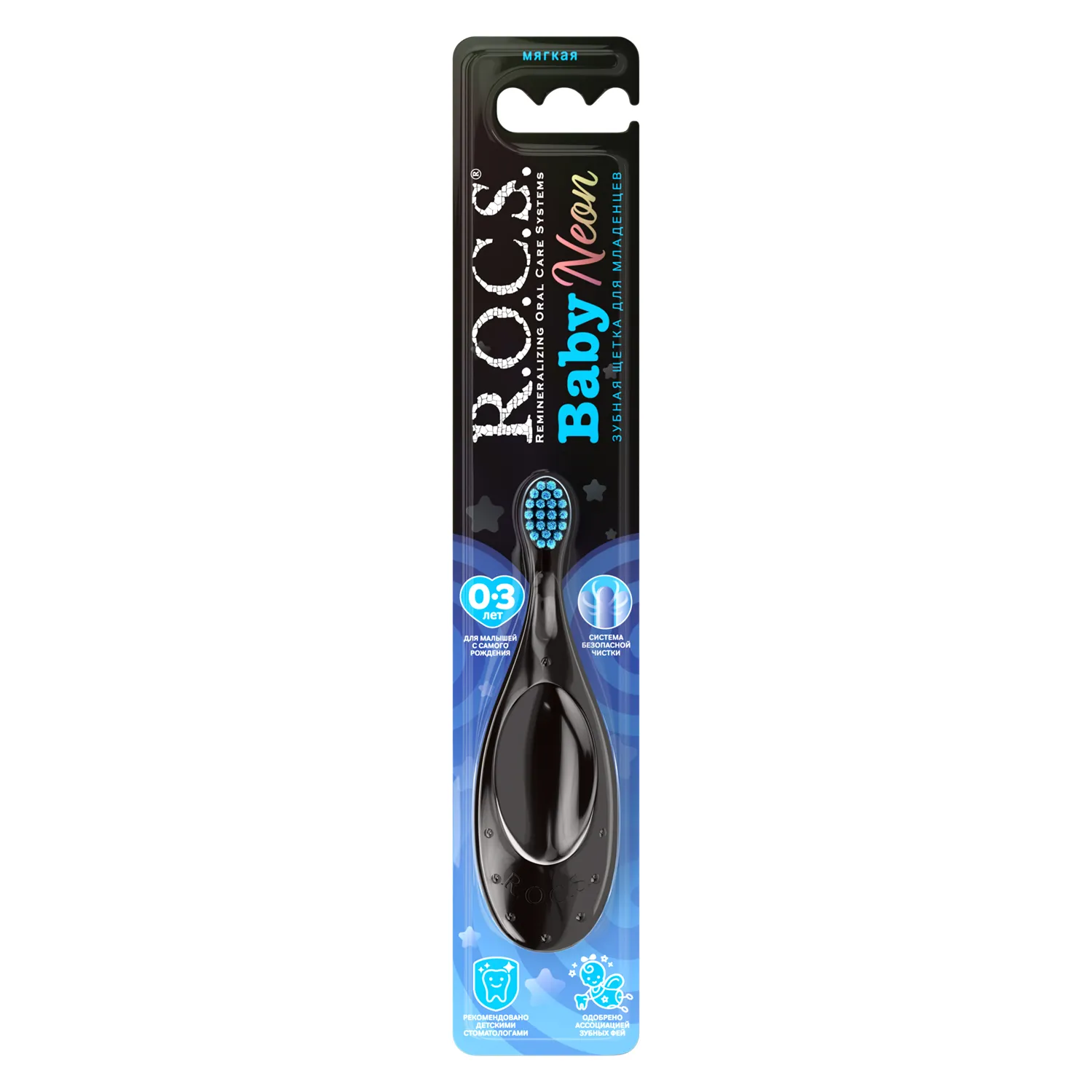 Детская зубная щетка R.O.C.S. «Baby NEON» предназначена для малышей в возрасте от 0 до 3 лет. Данная зубная щетка разработана научной лабораторией при участии детских стоматологов. Изделие учитывает возрастные особенности данного периода и имеет экстрамягкие щетинки, которые не повреждают нежную эмаль и мягкие ткани ротовой полости ребенка.